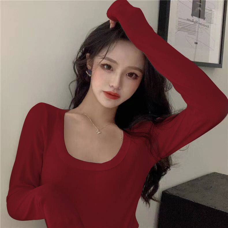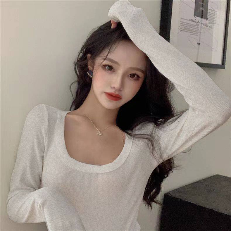 纯欲性感辣妹上衣修身 新款 女秋季 短款 打底衫 薄款 方领正肩百搭长袖