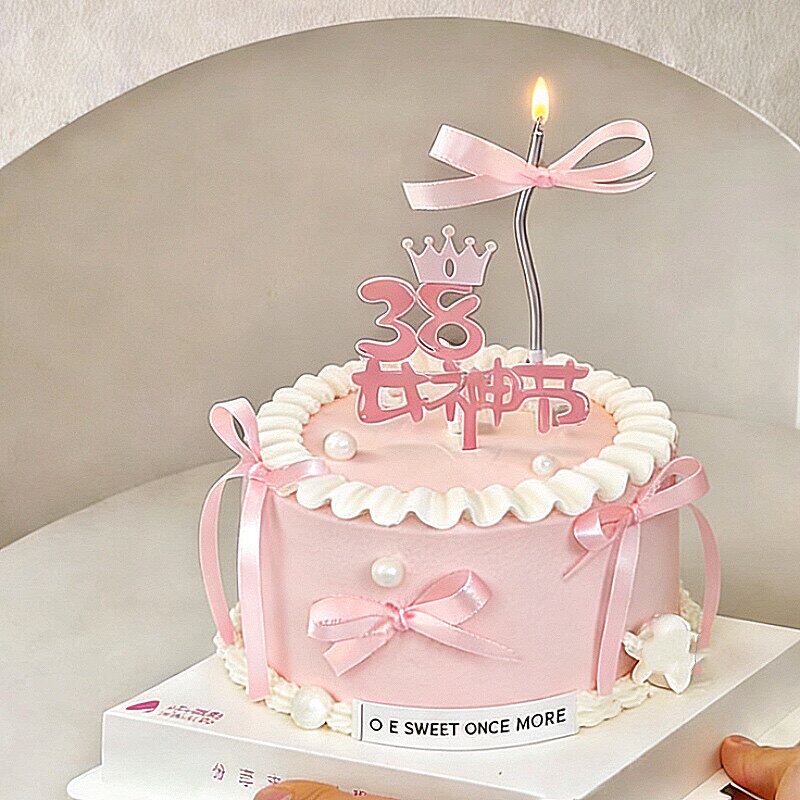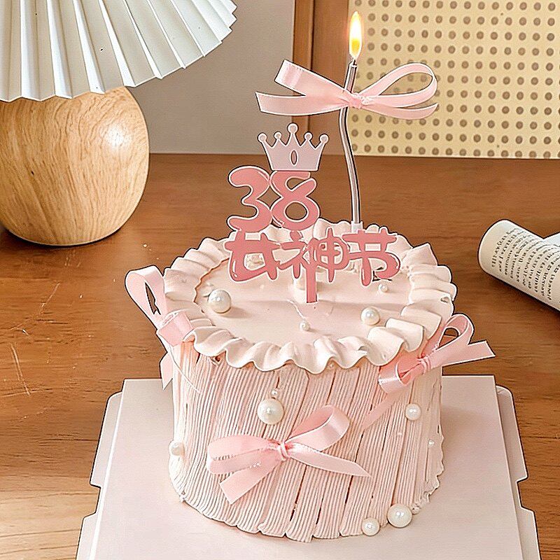 饰亚克力插件三八妇女节快乐插牌粉色丝带烘焙摆件 38女神节蛋糕装由