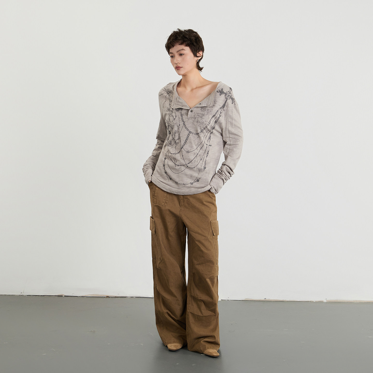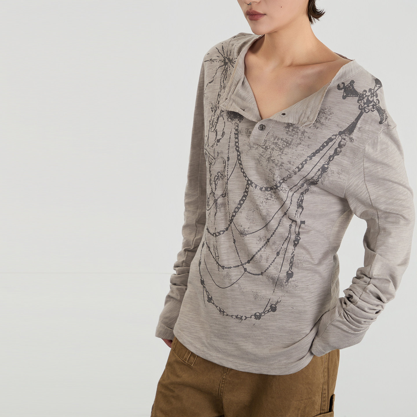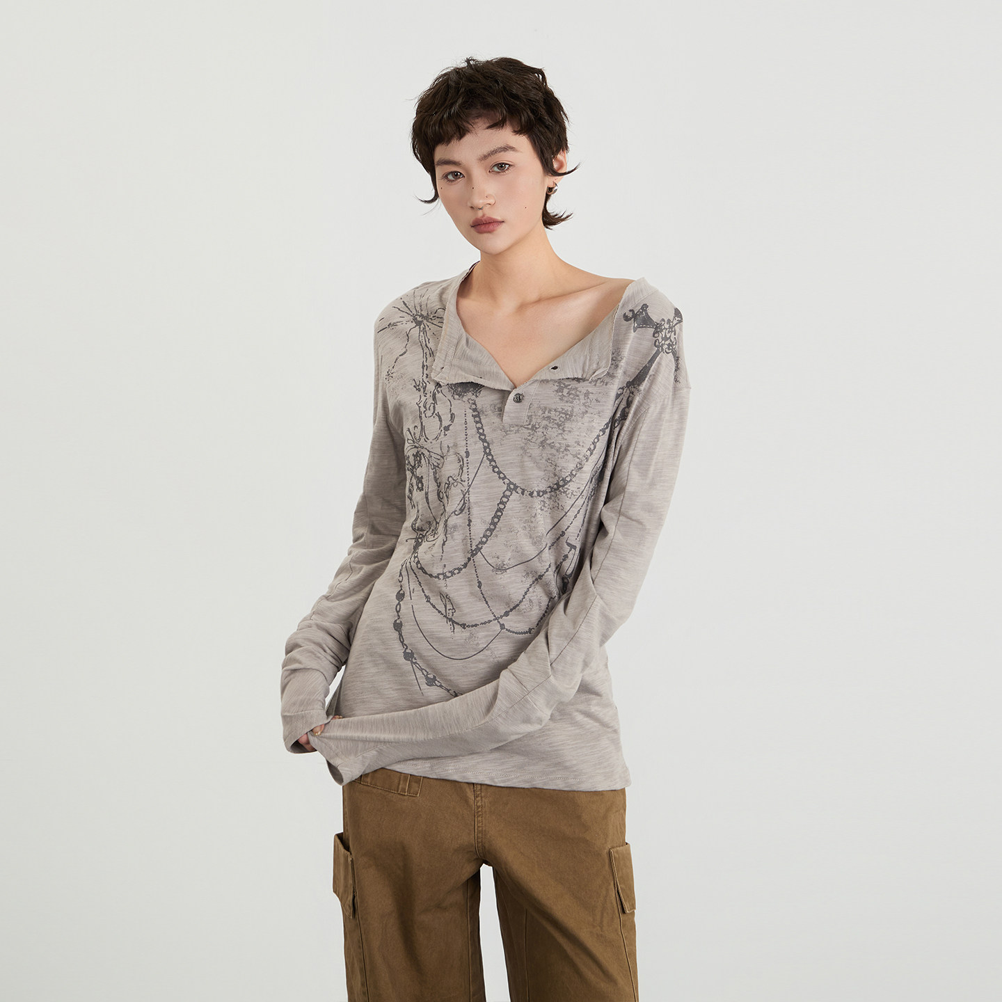 纽扣设计感亨利领印花长袖 T恤女宽松辣妹上衣 欧美春秋季 AIRHOOD由