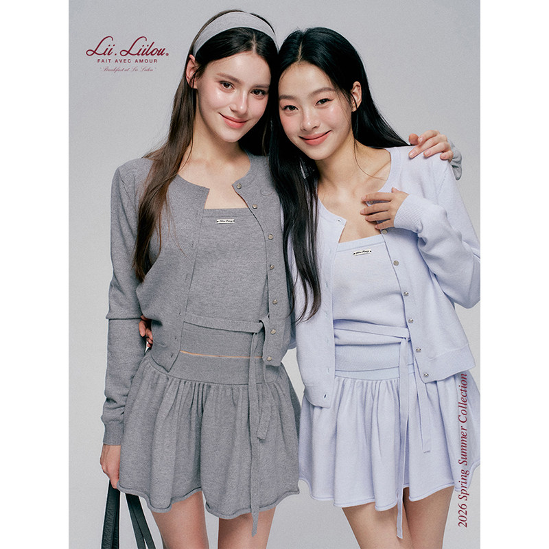 绵羊毛混纺 Liilou Clean girl 抹胸短半裙三件套 圆领针织短开衫
