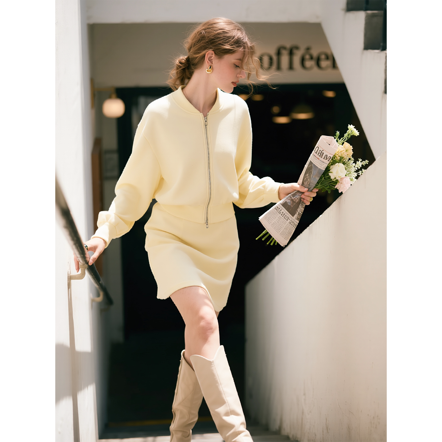 新款 奶黄色POLO领开衫 卫衣短裙套装 女2026年春季 两件套 极简风长袖