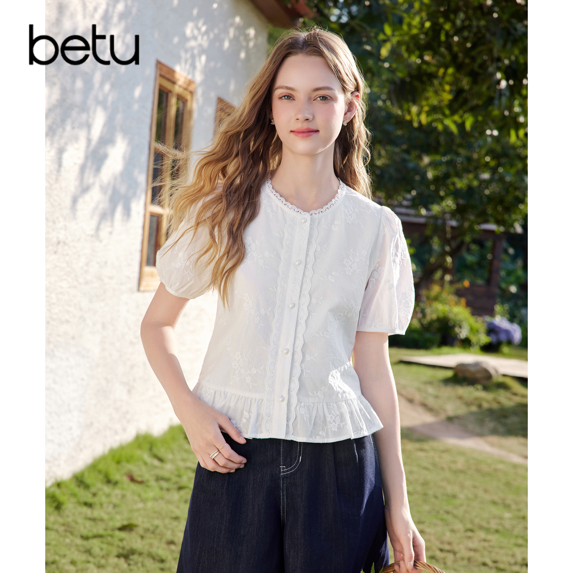 2026年夏季 betu百图法式 白色刺绣衬衫 女泡泡袖 花边圆领衬衣 新款