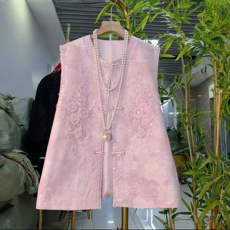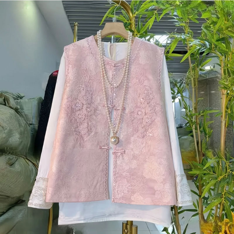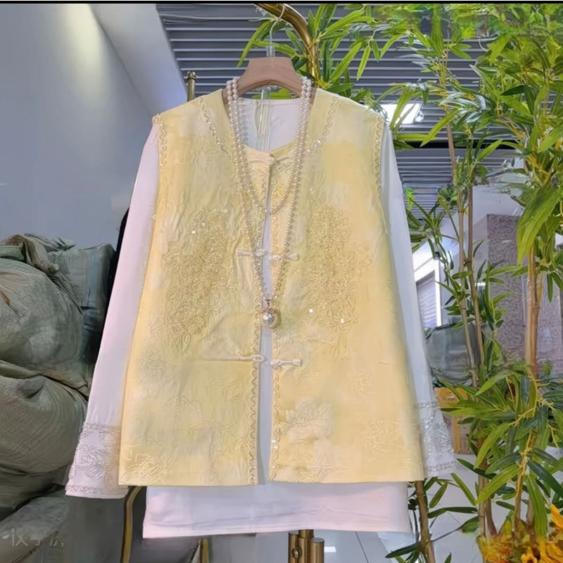 轻奢国风提花亮钻盘扣马甲打底衫 新中式 两件套 款 2026春季 大码 女装