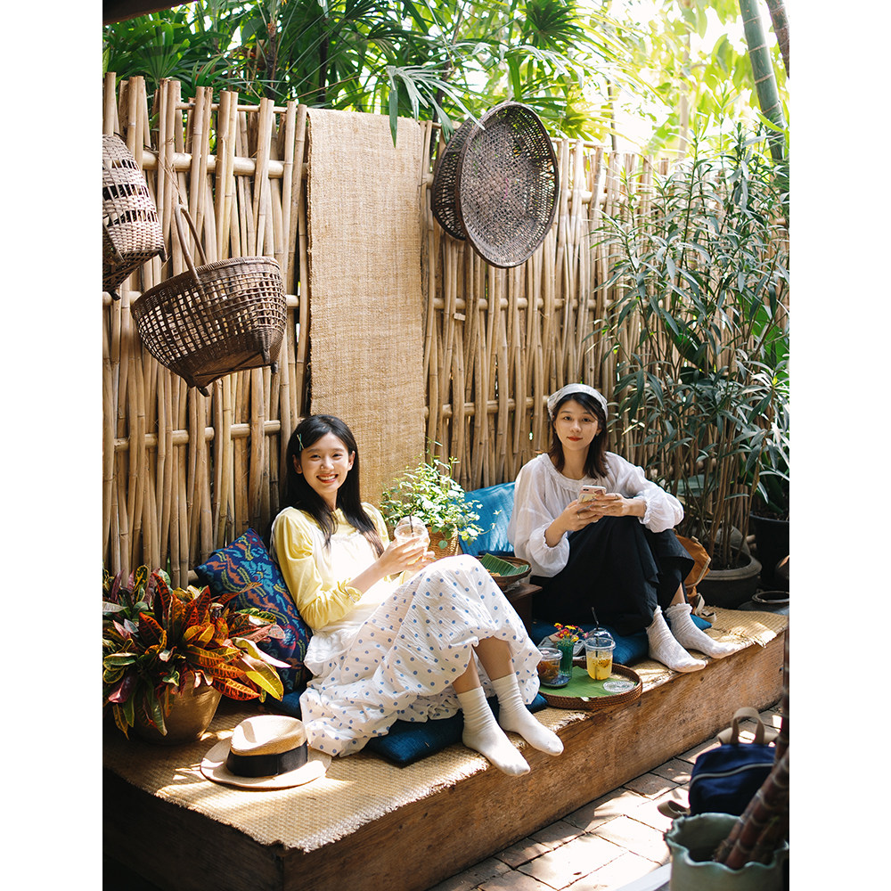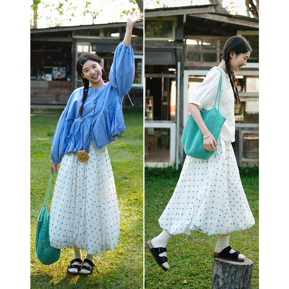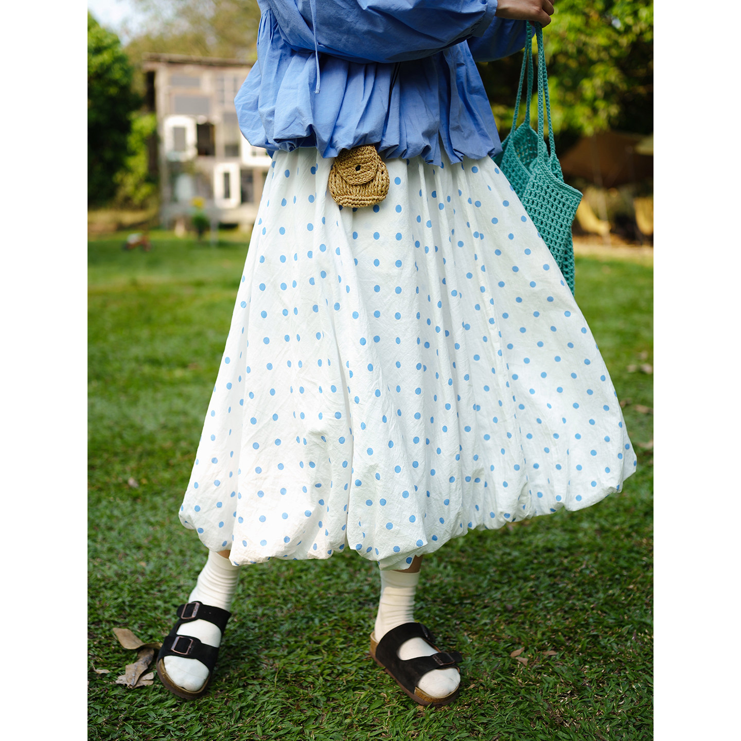 100棉柔软不易皱 显瘦森系清迈松弛裙子 日系蓝波点花苞半裙 古苔由