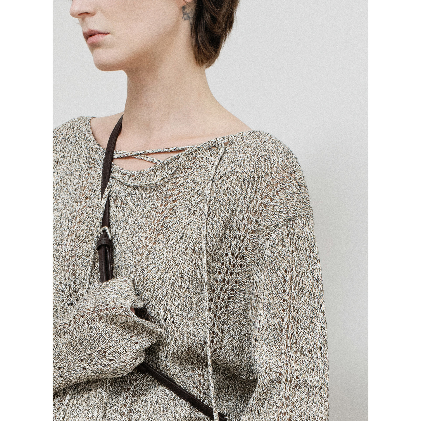 新款 B941 上衣女2026春季 322WORKHOUSE亚麻混纺镂空v领绑带针织衫