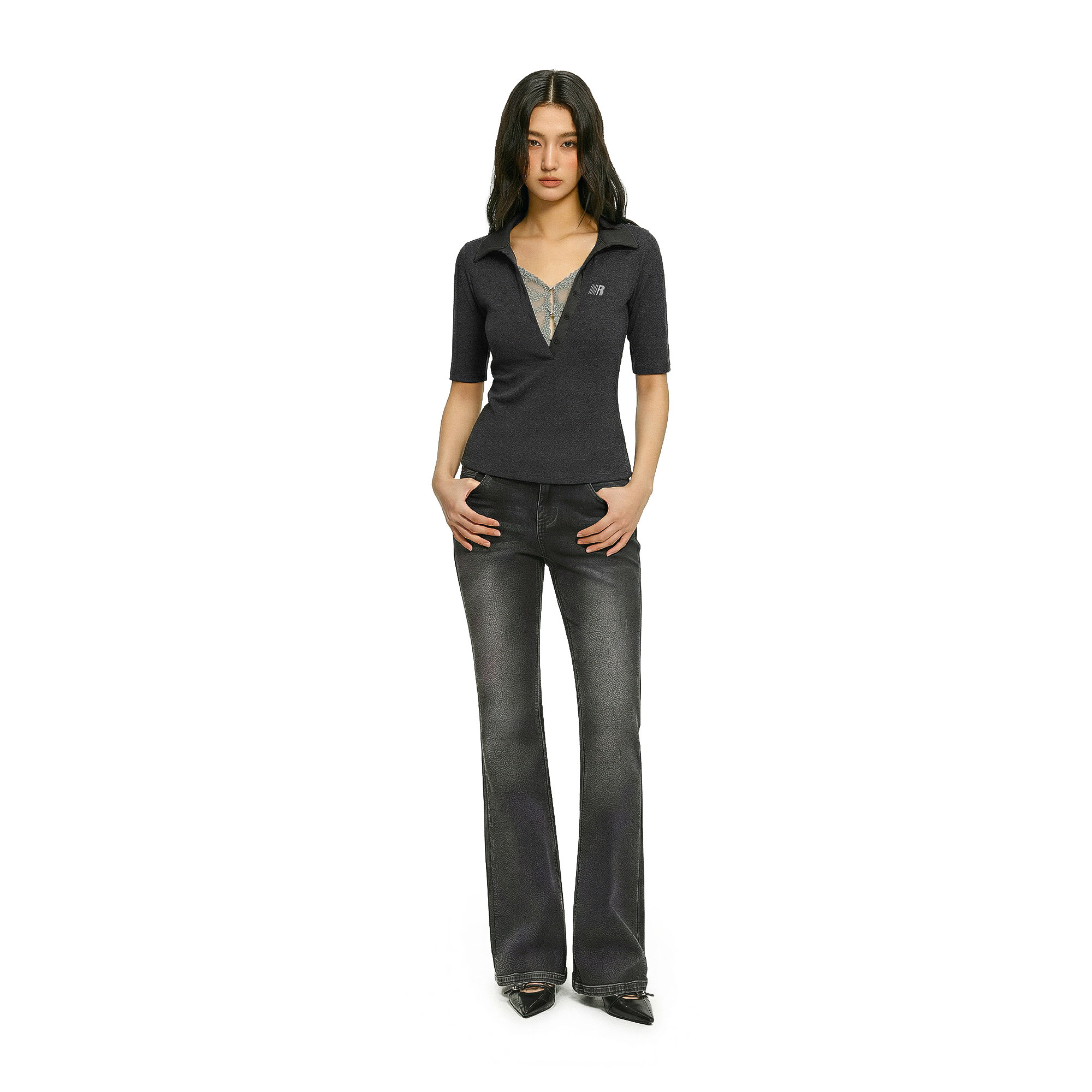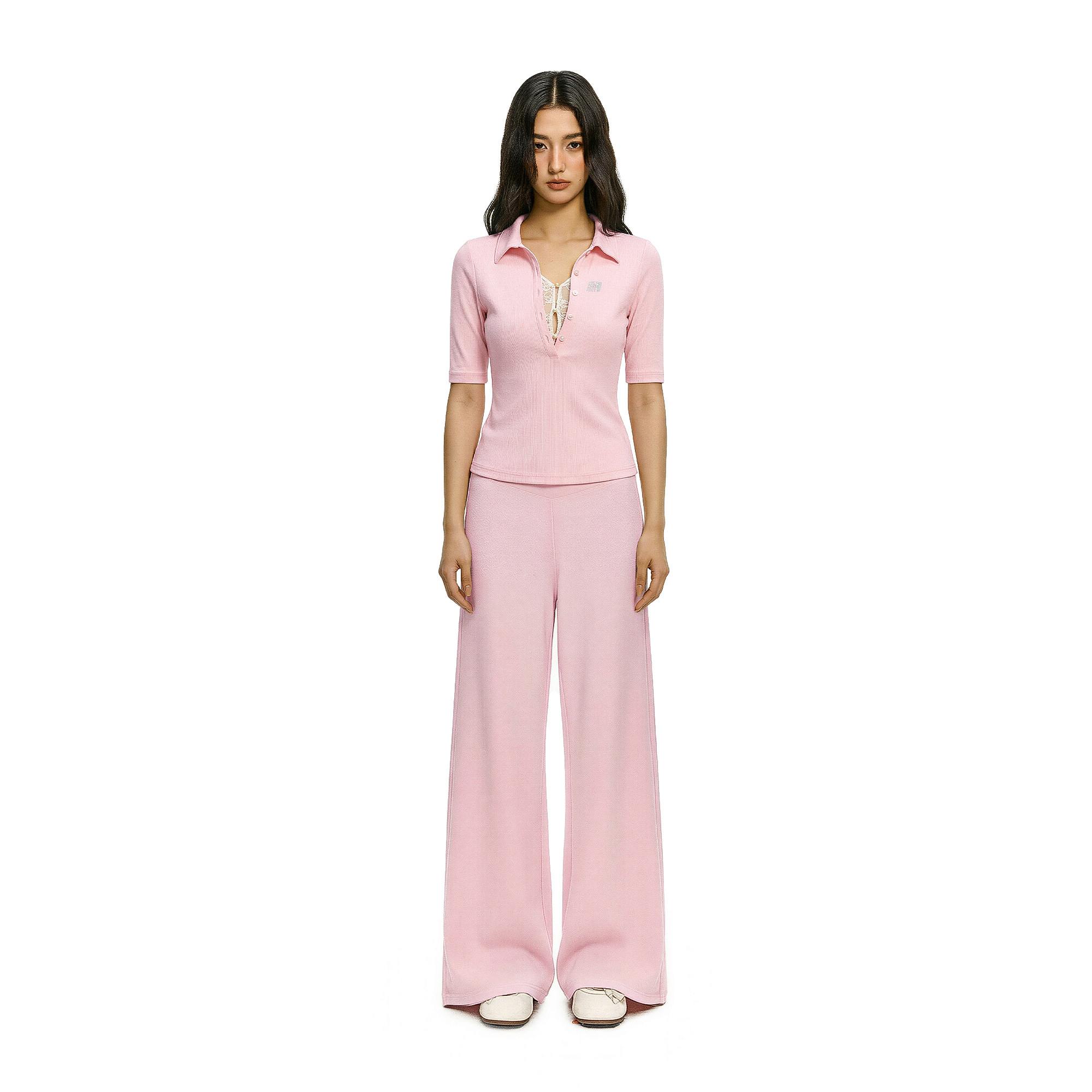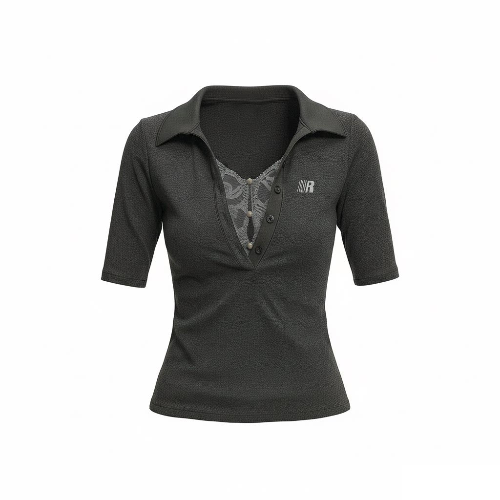 FDR官方店 短袖 t恤女2026新款 超好看夏v领蕾丝假两件上衣收腰修身