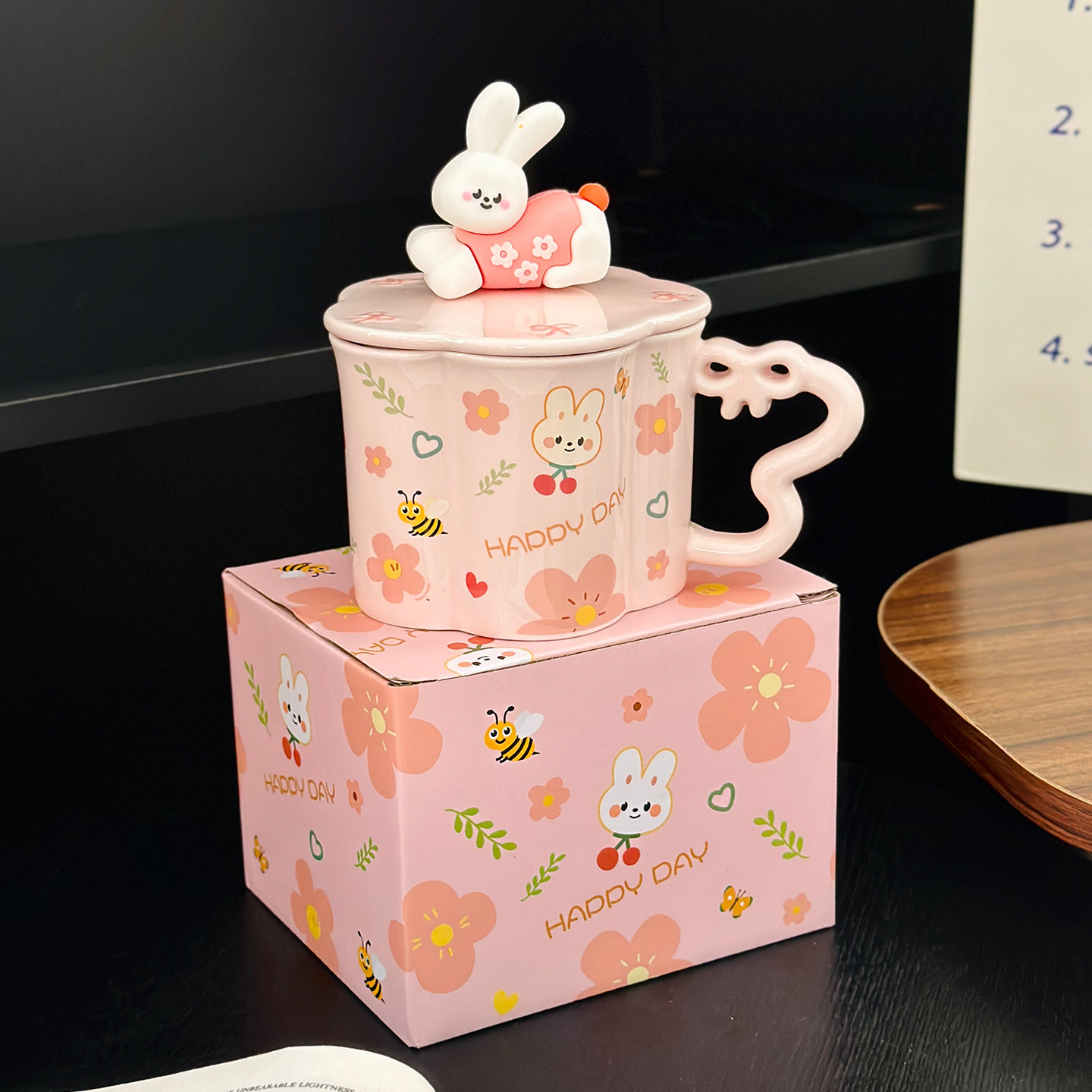 杯子生日礼物 可爱卡通兔子陶瓷马克杯带盖蝴蝶结把手水杯超好看