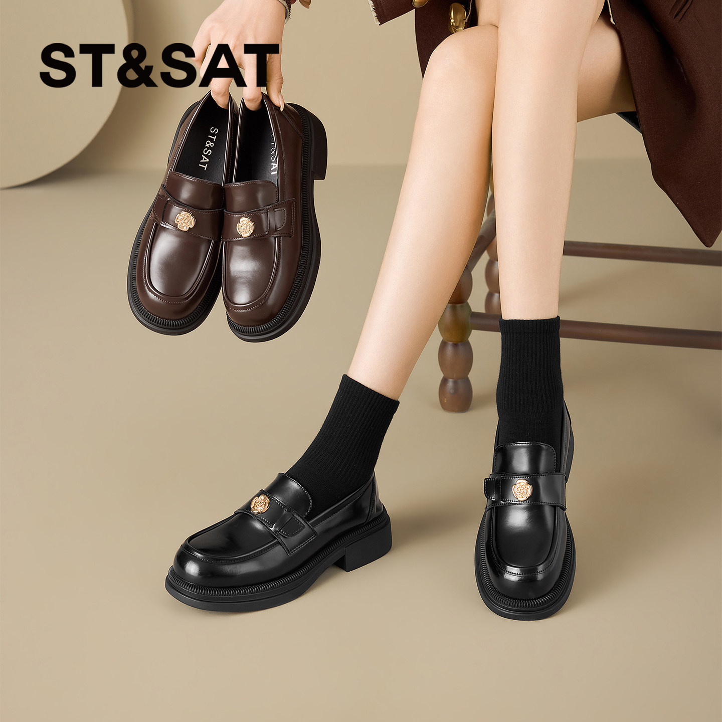 女鞋 思加图2026新款 A9125AA6 一脚蹬单鞋 平底鞋 棕色乐福鞋 豆豆鞋