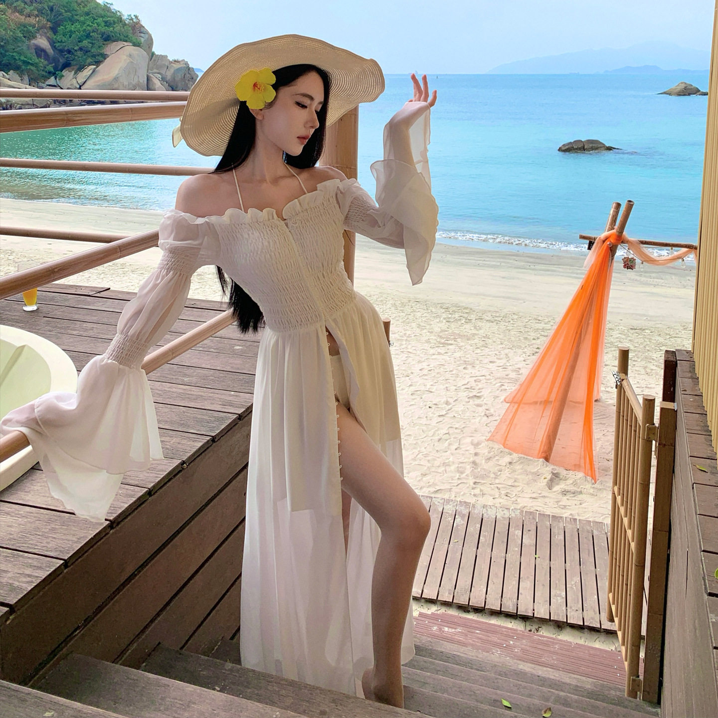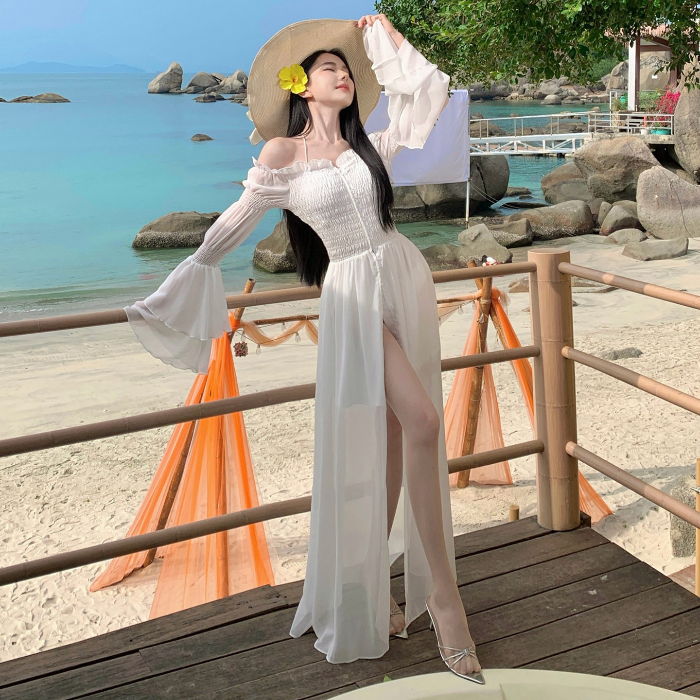 Poire 海岛女神 白色喇叭袖 开叉抹胸仙度假风沙滩连衣裙 Fleur