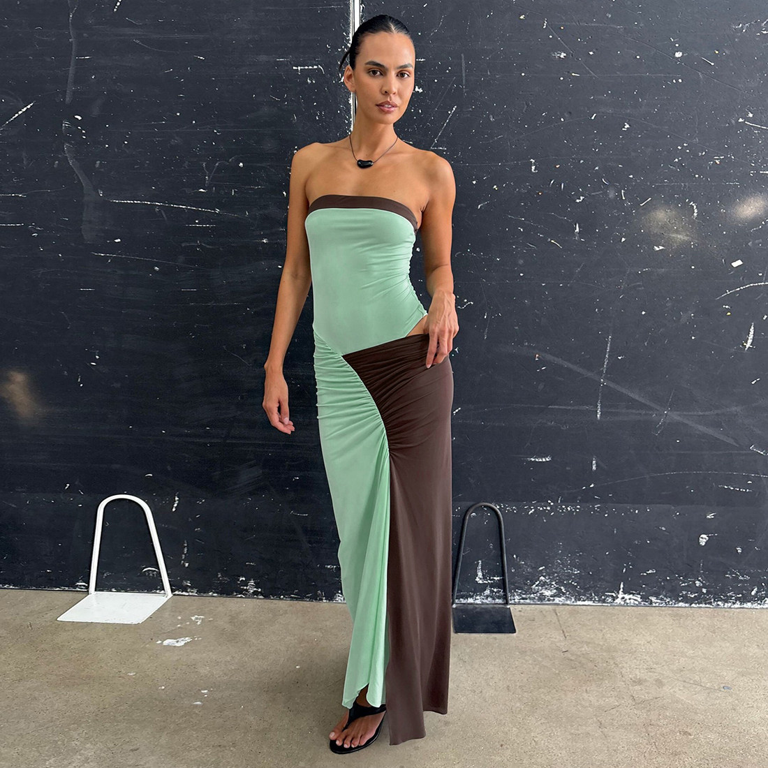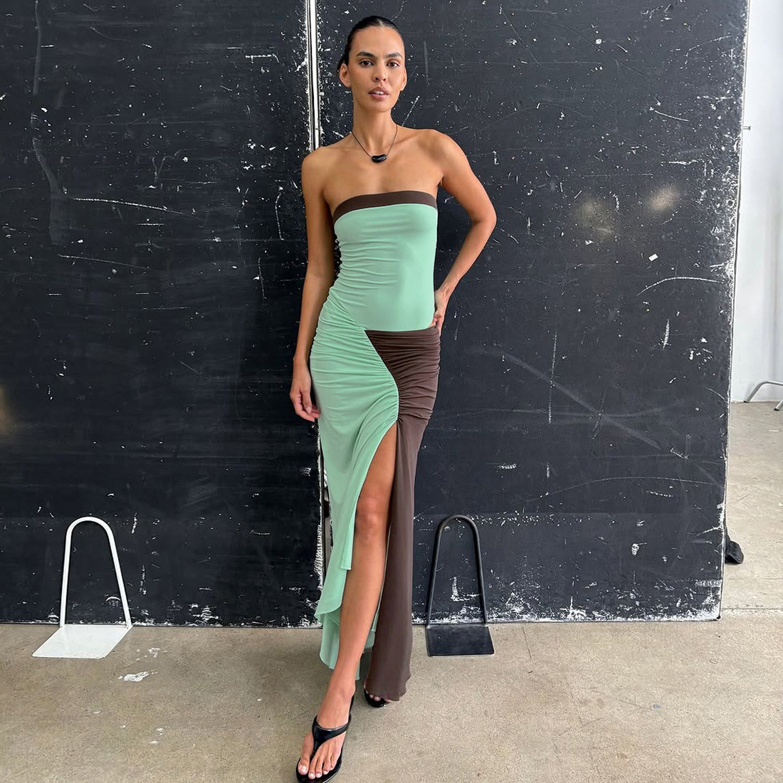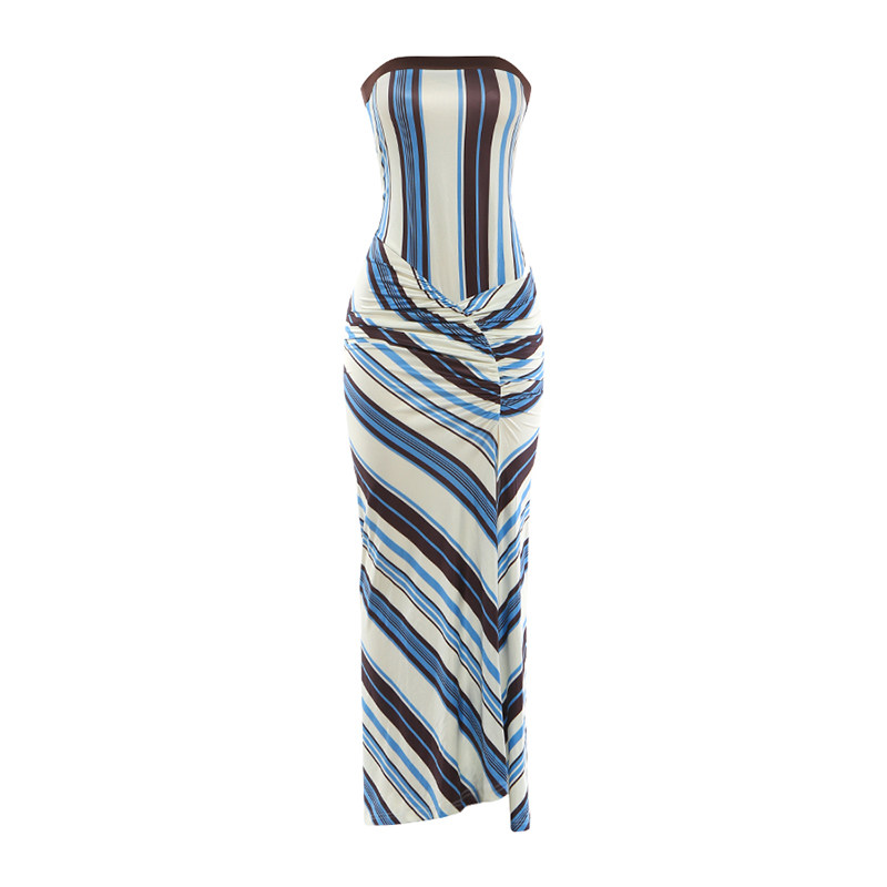 调性经典 Sisjuly 时尚 不规则褶皱开叉抹胸连衣裙女 撞色条纹长裙