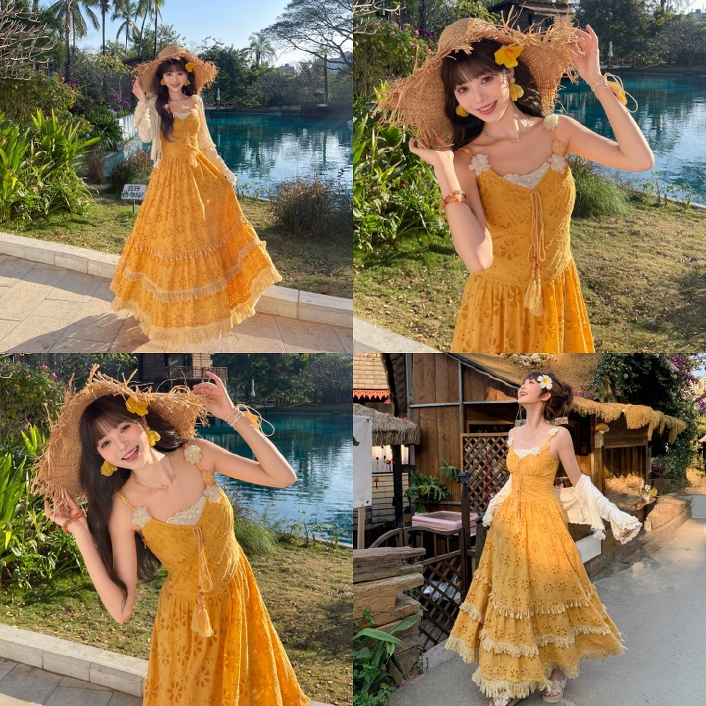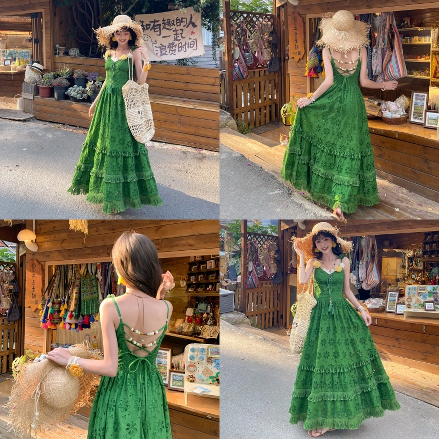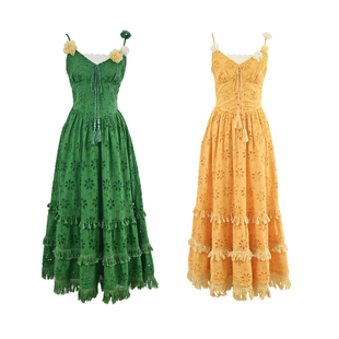 吃绿色菜 气质无袖 挂脖交叉系带连衣裙度假长裙 内有衬裙 樱落
