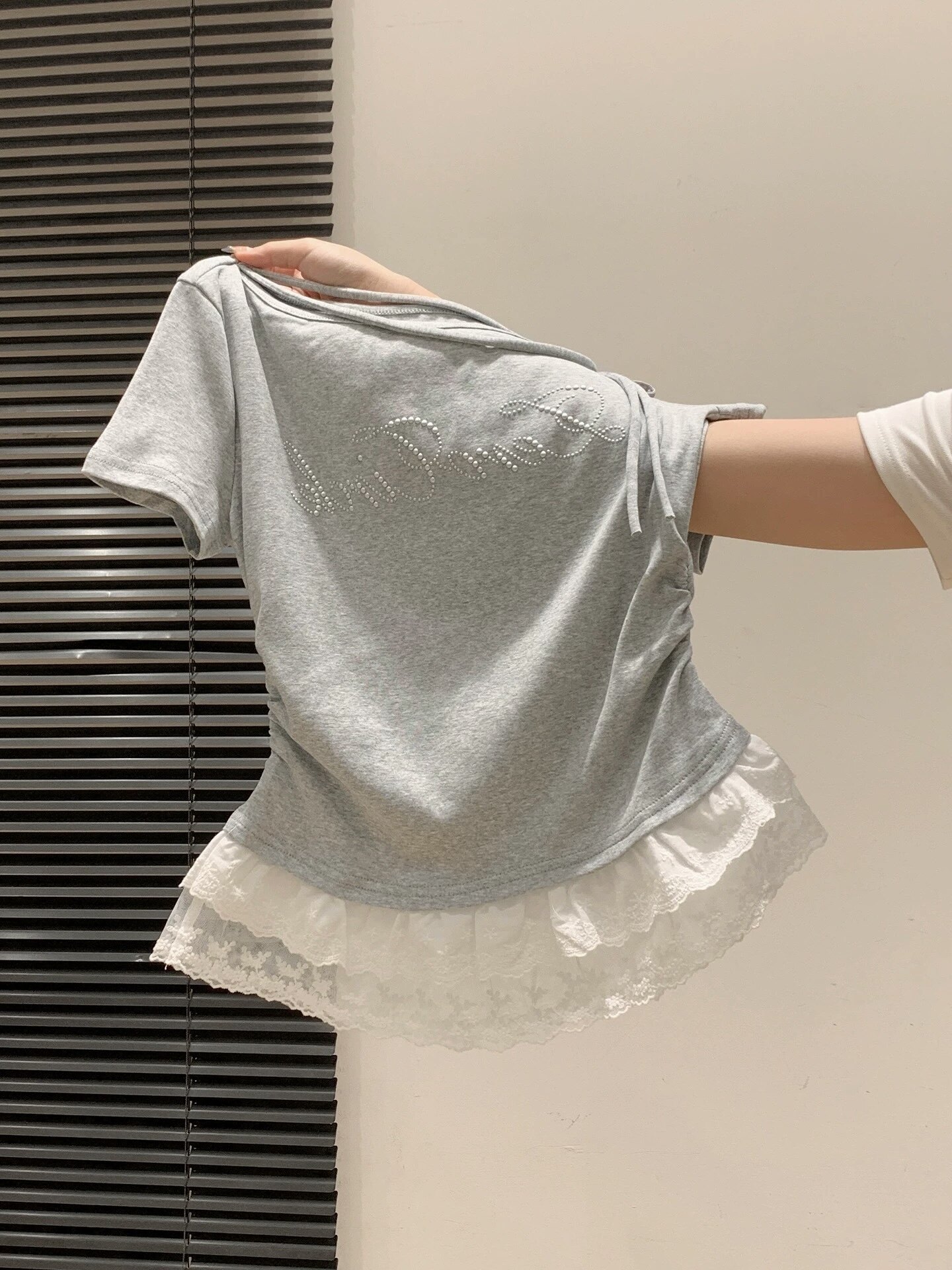 为您提供商品韩系2026夏季 斜领露肩蕾丝花边下摆短袖 T恤女显瘦修身 小上衣 新款的详细介绍,