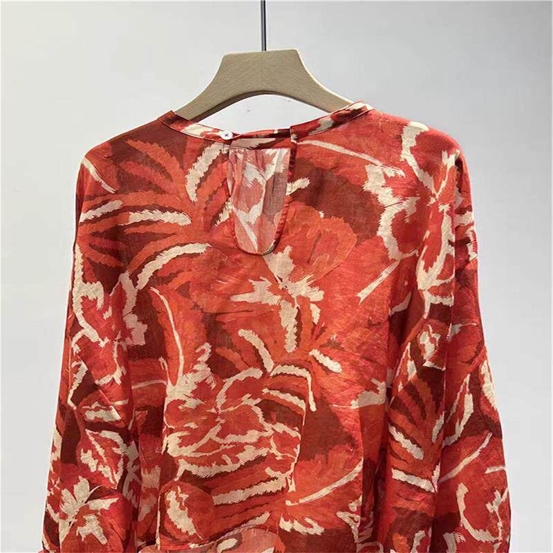 为您提供商品复古红色印花亚麻衬衫 小资慵懒松弛感气质女士上衣夏 通勤穿搭法式的详细介绍,