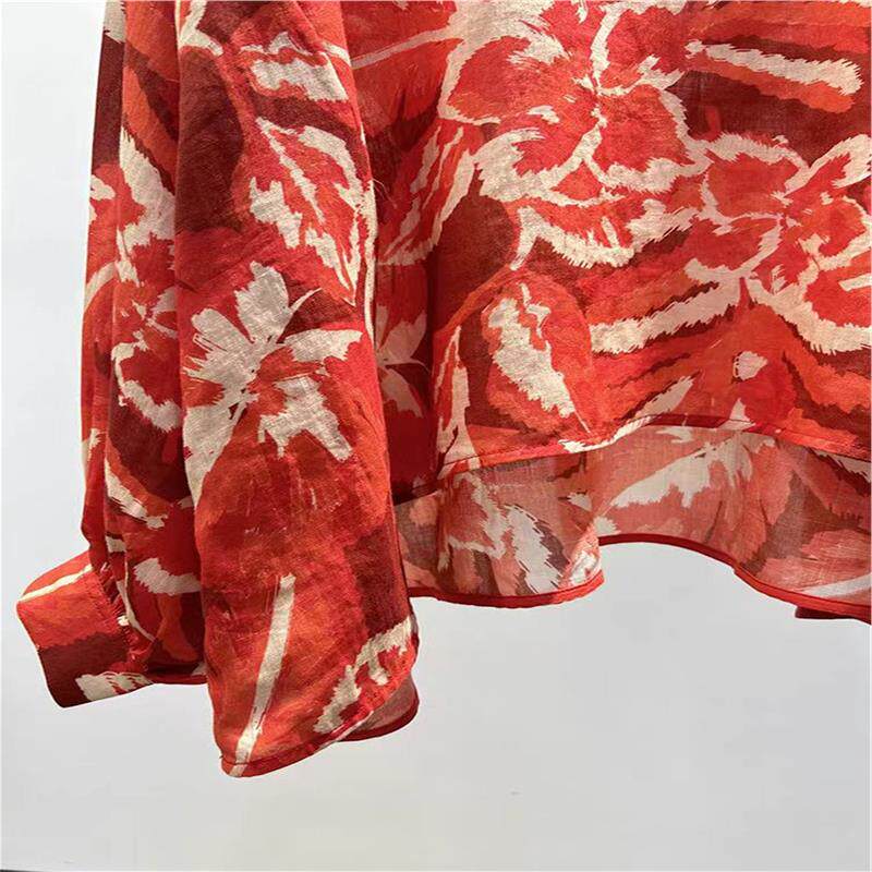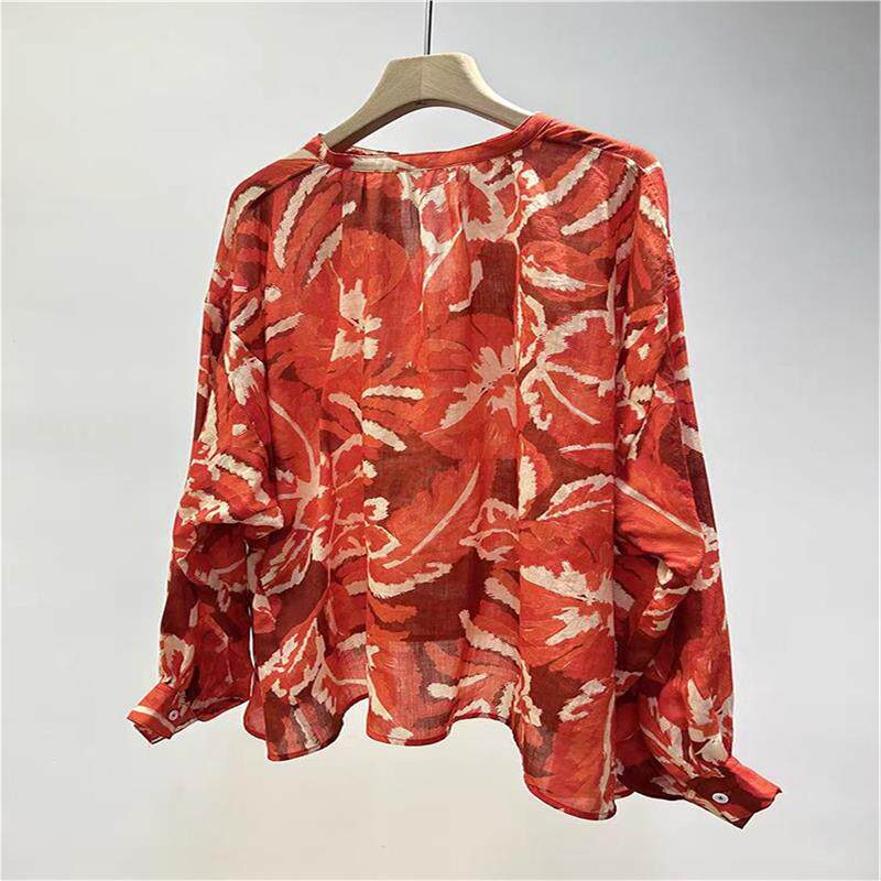 复古红色印花亚麻衬衫 小资慵懒松弛感气质女士上衣夏 通勤穿搭法式