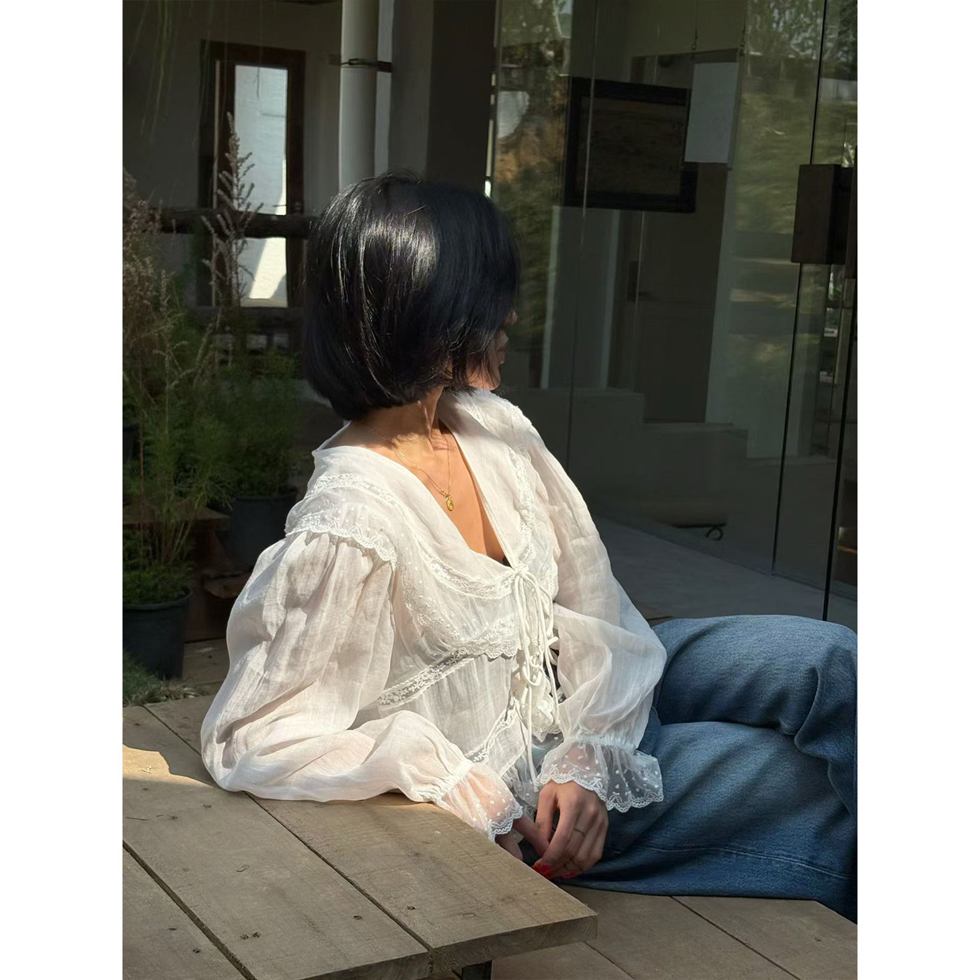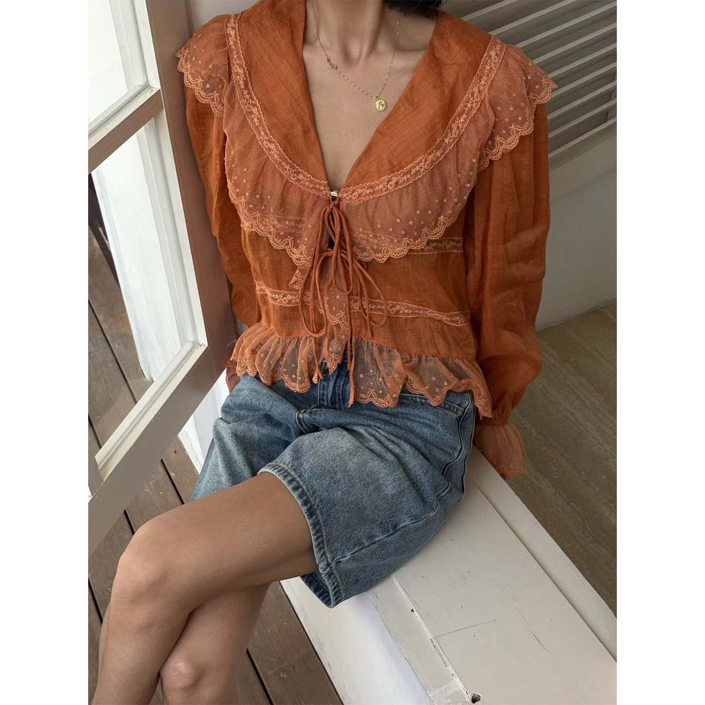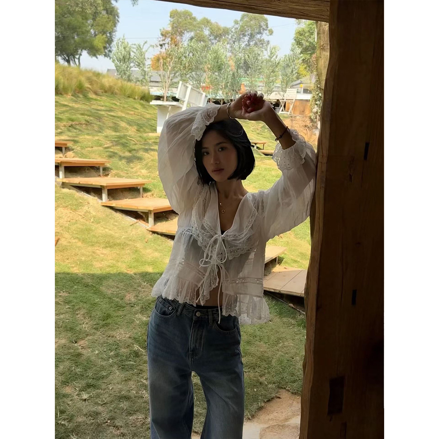 为您提供商品女长袖 2026新款 法式 浪漫风蕾丝花边系带衬衫 甜美苎麻宽松V领小衫的详细介绍,