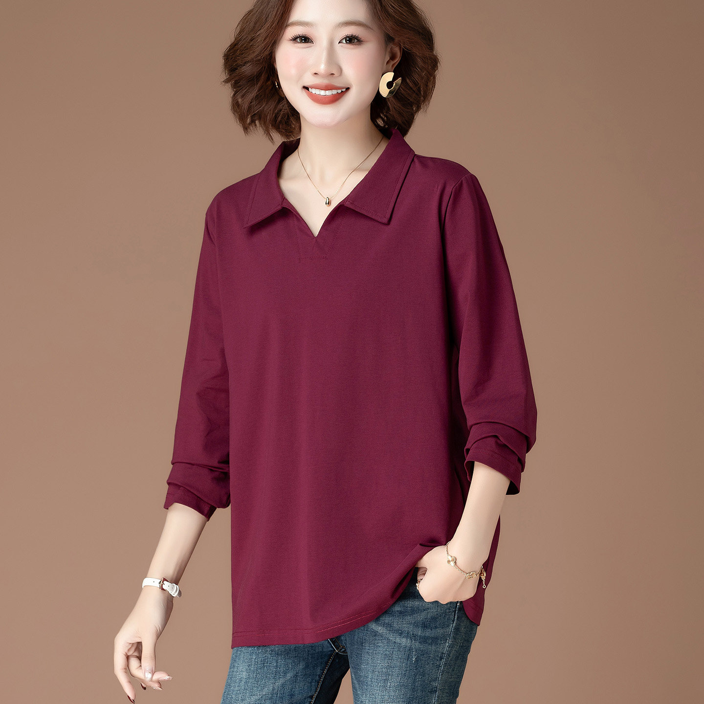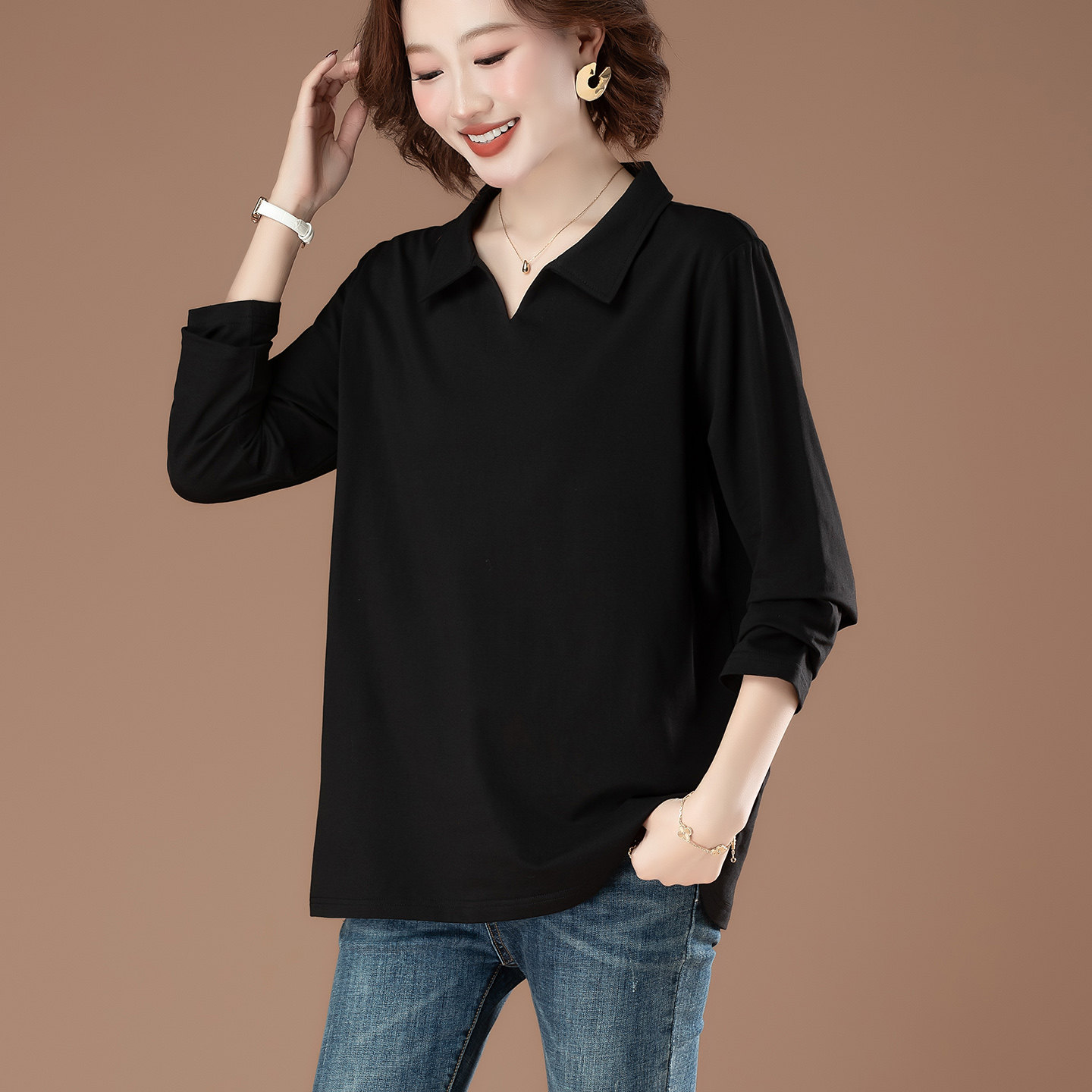 纯棉翻领长袖 打底衫 妈妈装 中老年人简约上衣女 T恤女春秋宽松大码