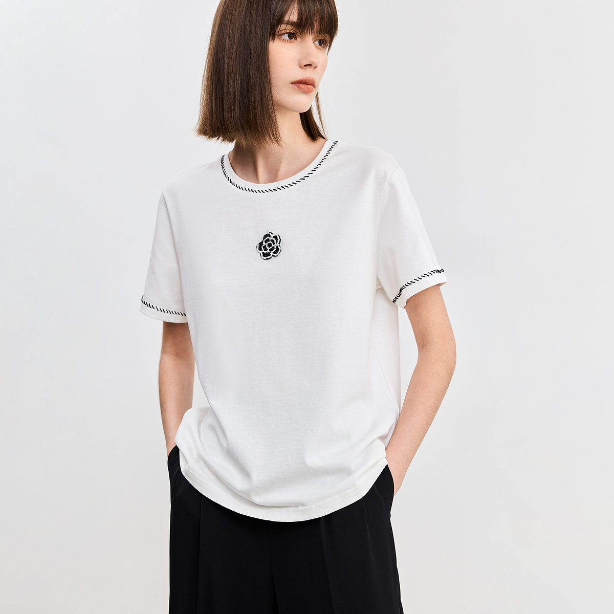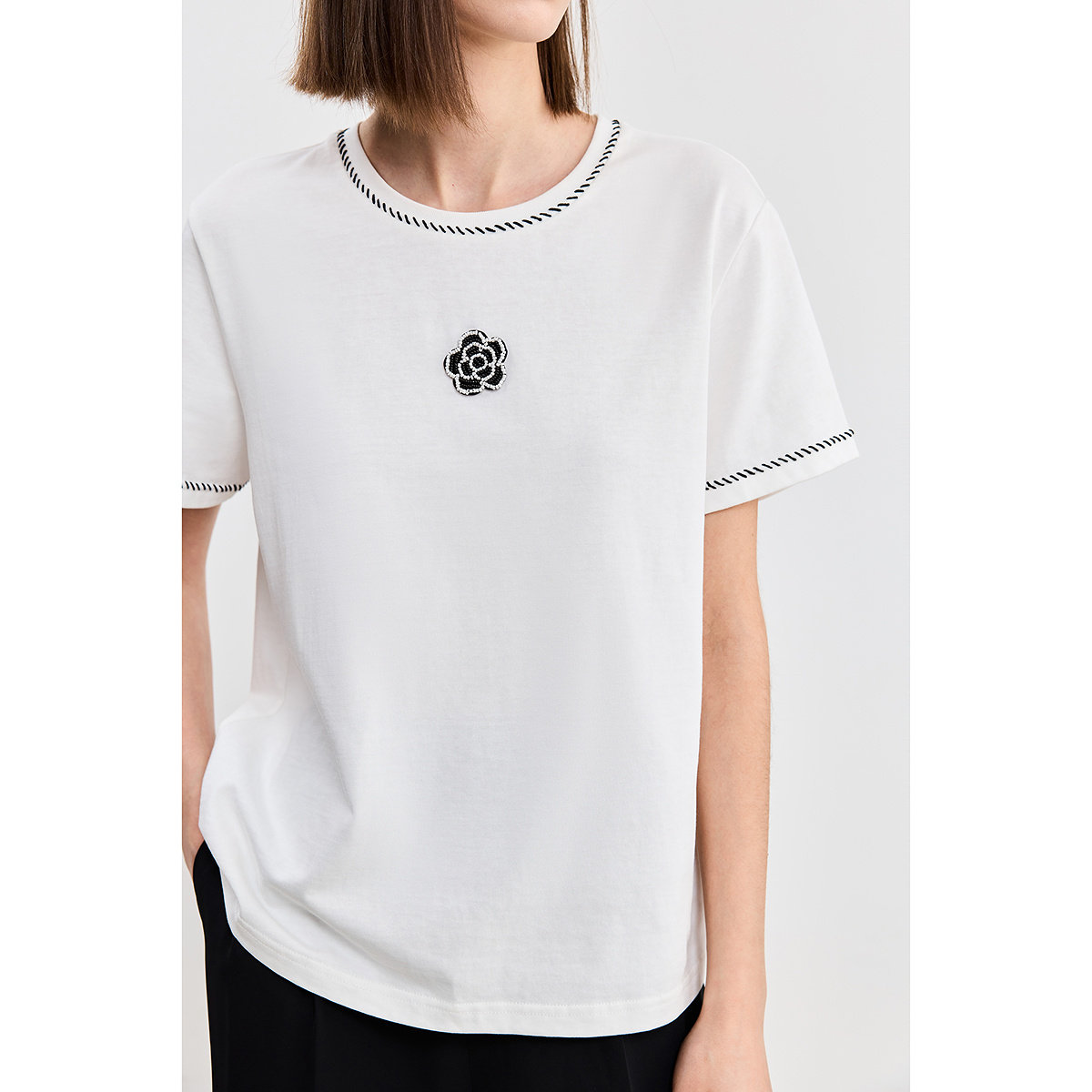 LILY2026夏新款 T恤上衣女 全棉简约撞色串珠图案休闲通勤白色短袖由