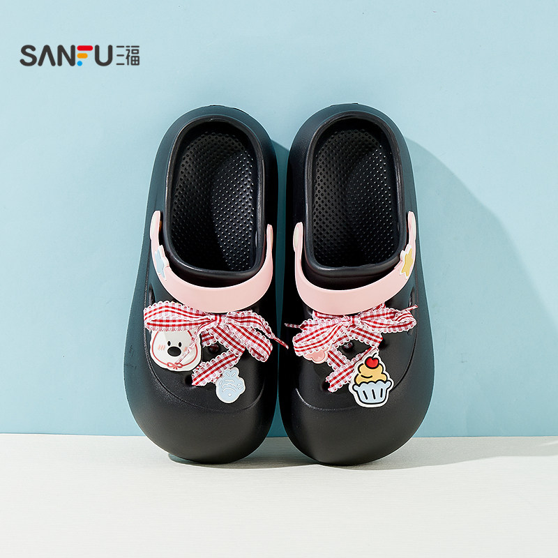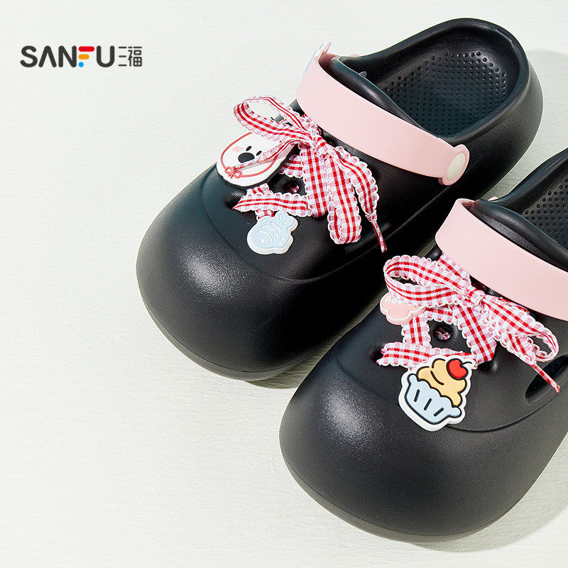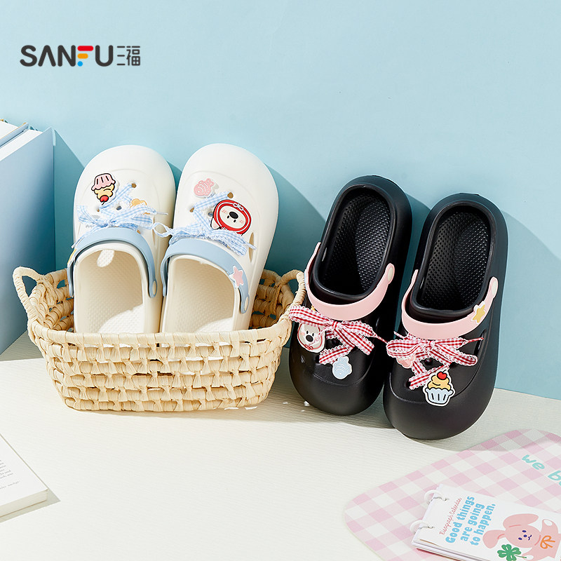 三福女款 一字拖 生活家居拖鞋 855153 外穿撞色格子绑带洞洞鞋