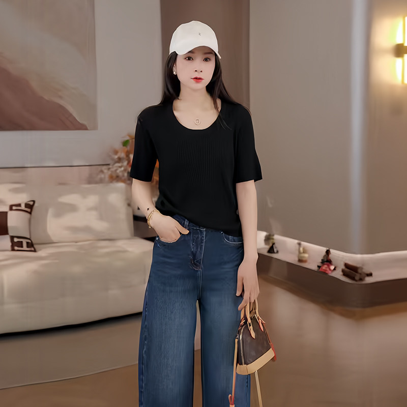 短袖 薄款 条纹针织T恤女春季 打底衫 上衣26CD13005 显瘦中袖 豆豆