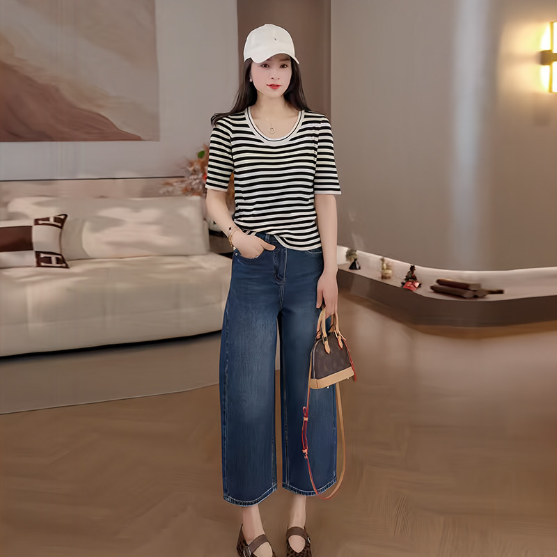 短袖 薄款 条纹针织T恤女春季 打底衫 上衣26CD13005 显瘦中袖 豆豆由