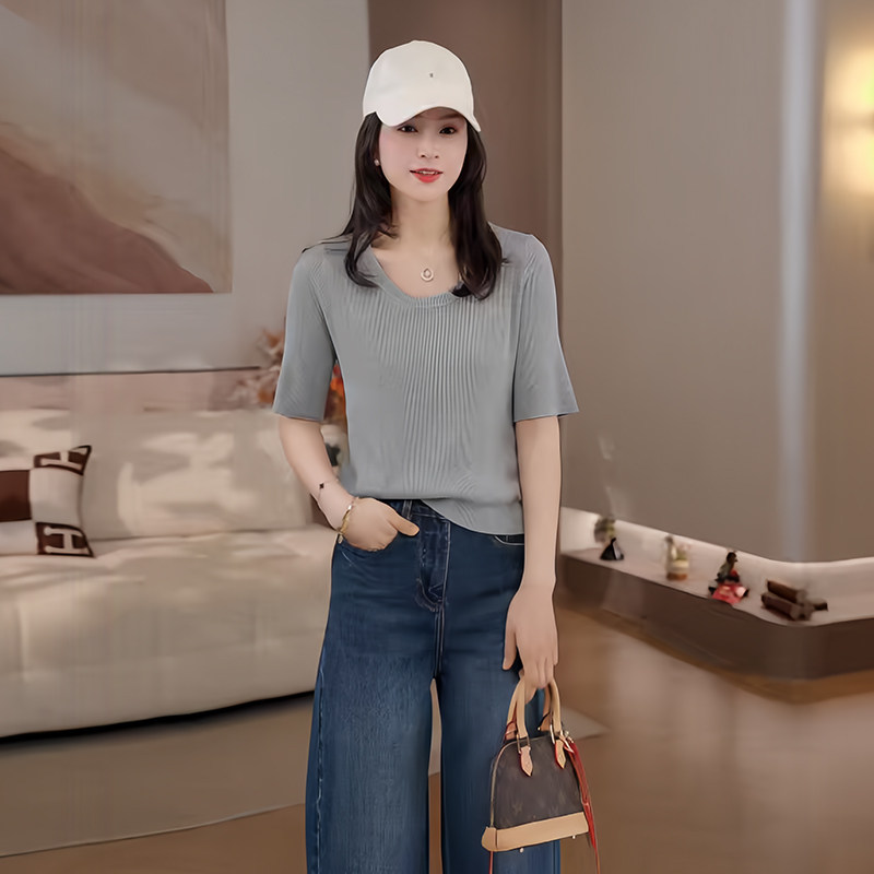 为您提供商品短袖 薄款 条纹针织T恤女春季 打底衫 上衣26CD13005 显瘦中袖 豆豆的详细介绍,