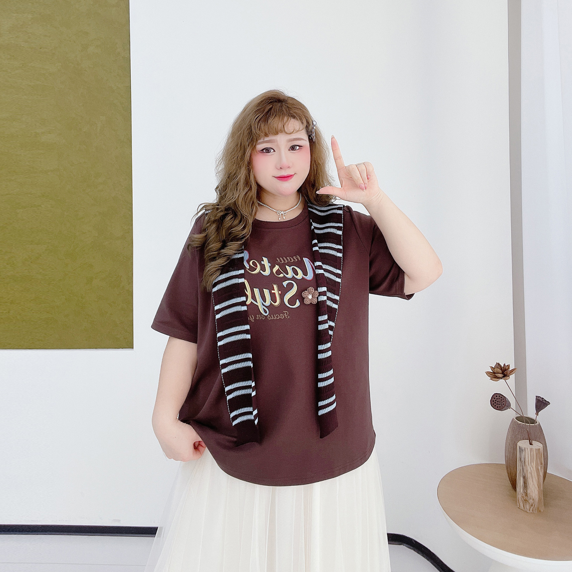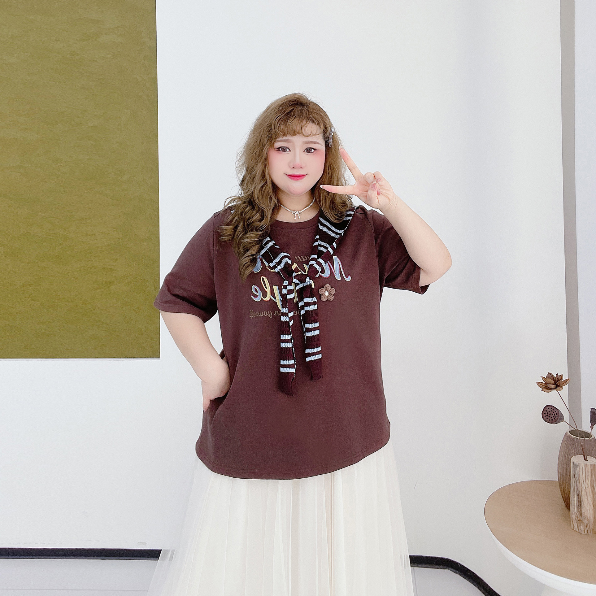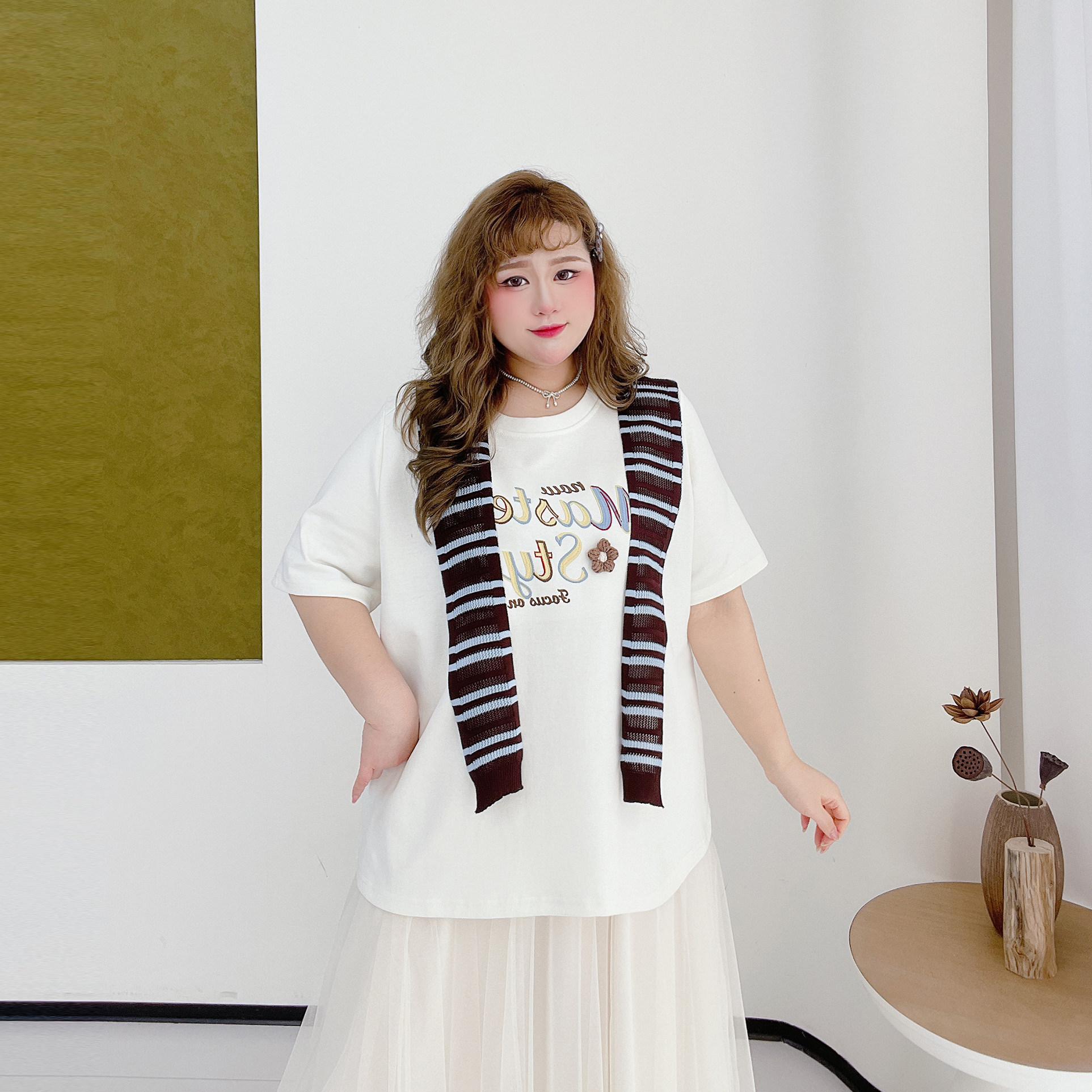 元 韩系俏皮软语小众上衣胖莹莹大码 女装 夏季 气遮肉披肩刺绣T恤衫