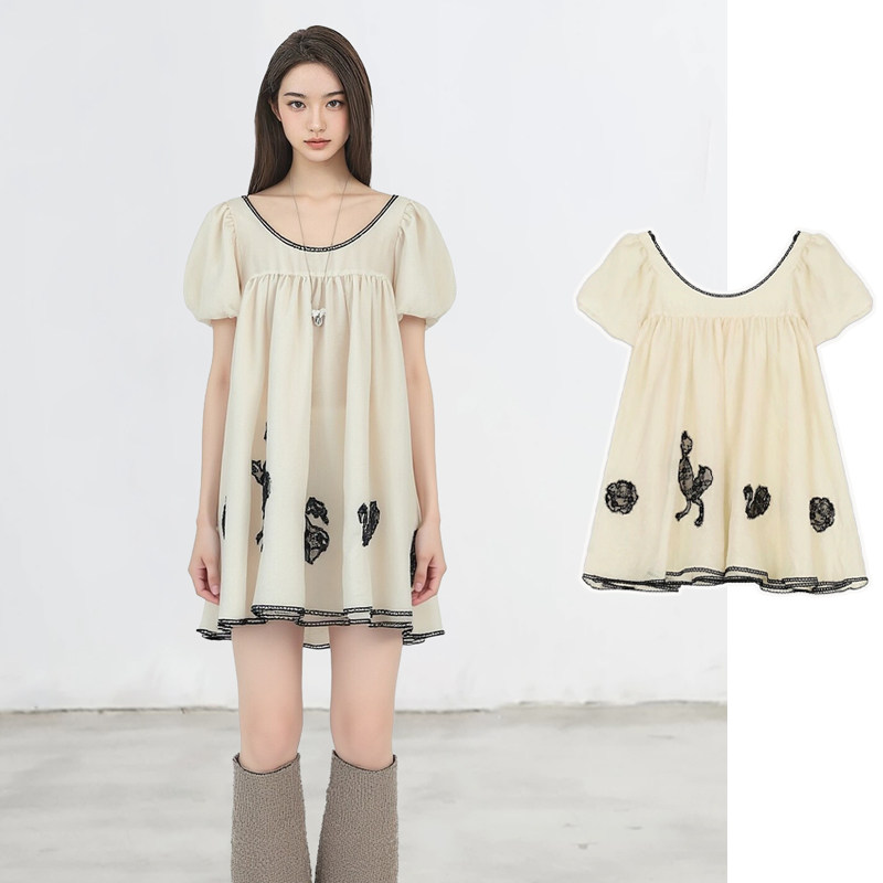 jennie同款 连衣裙女夏季 轻薄娃娃裙叠穿短袖 上衣 杏色甜美风泡泡袖