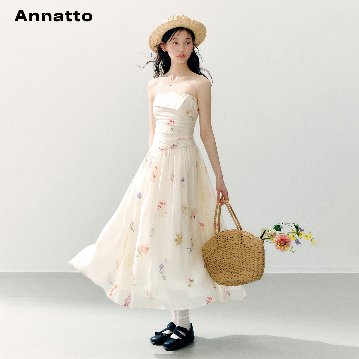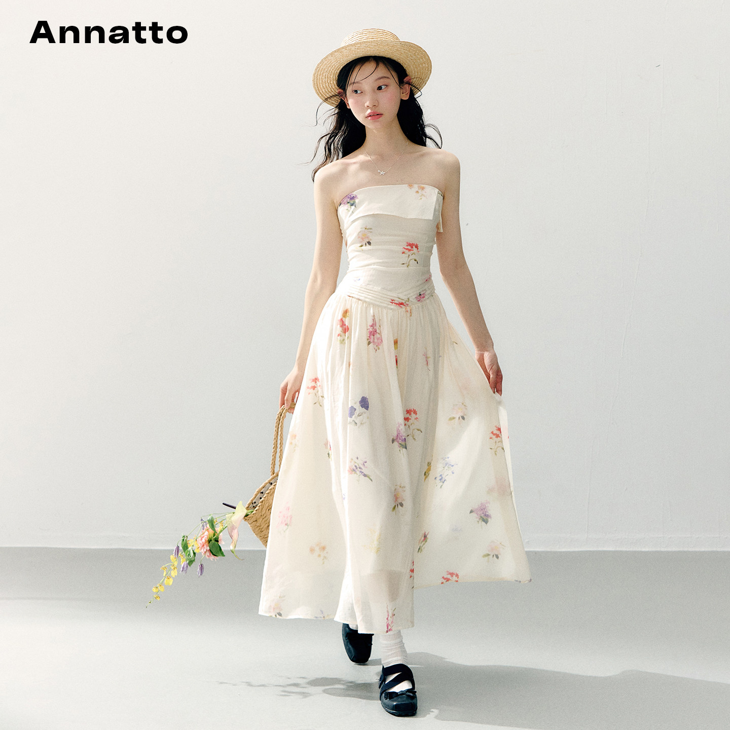为您提供商品浪漫风抹胸连衣裙女夏翻折领花卉印花修身 长裙 莫奈花野 ANNATTO的详细介绍,