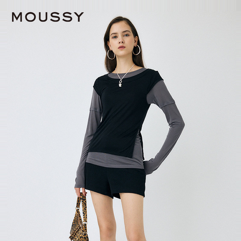 T恤010IA280 2181 长袖 moussy早春优雅双色拼接莱赛尔修身