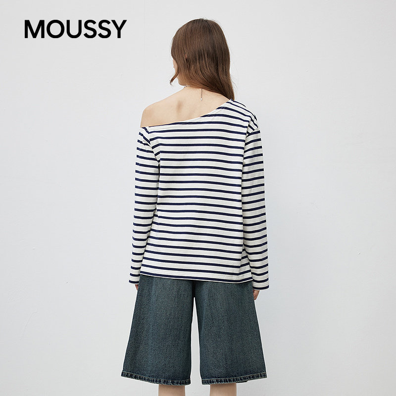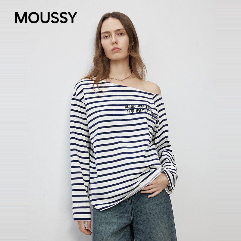 moussy 性感慵懒斜肩条纹撞色长袖 T恤028ISB80 1003 春季