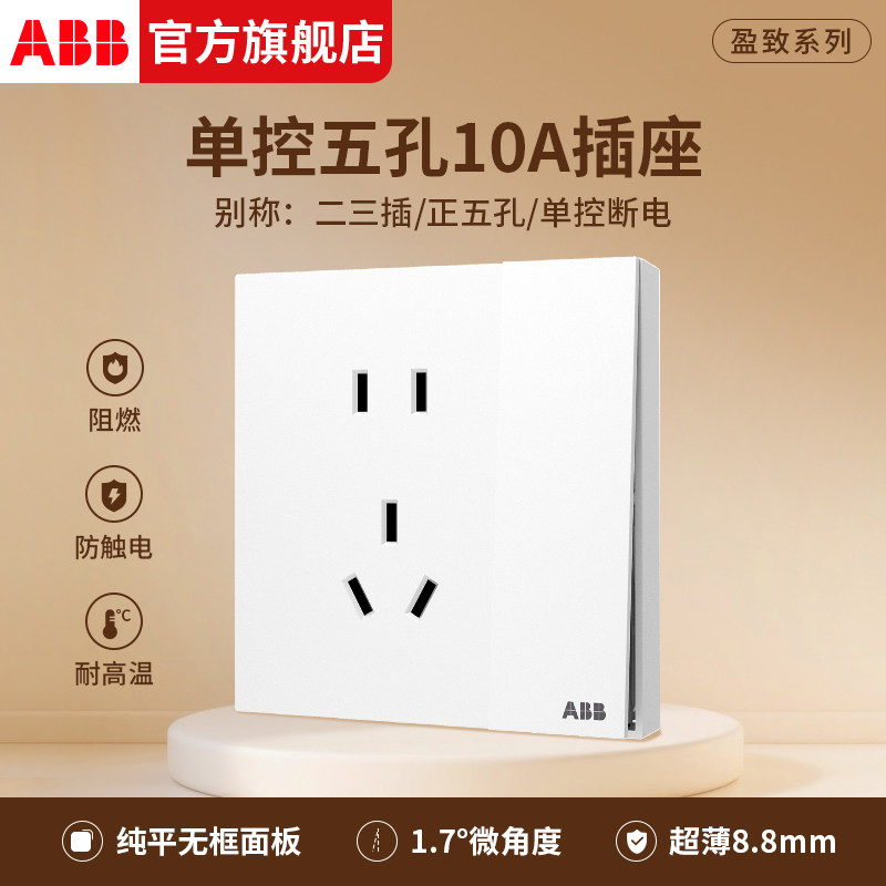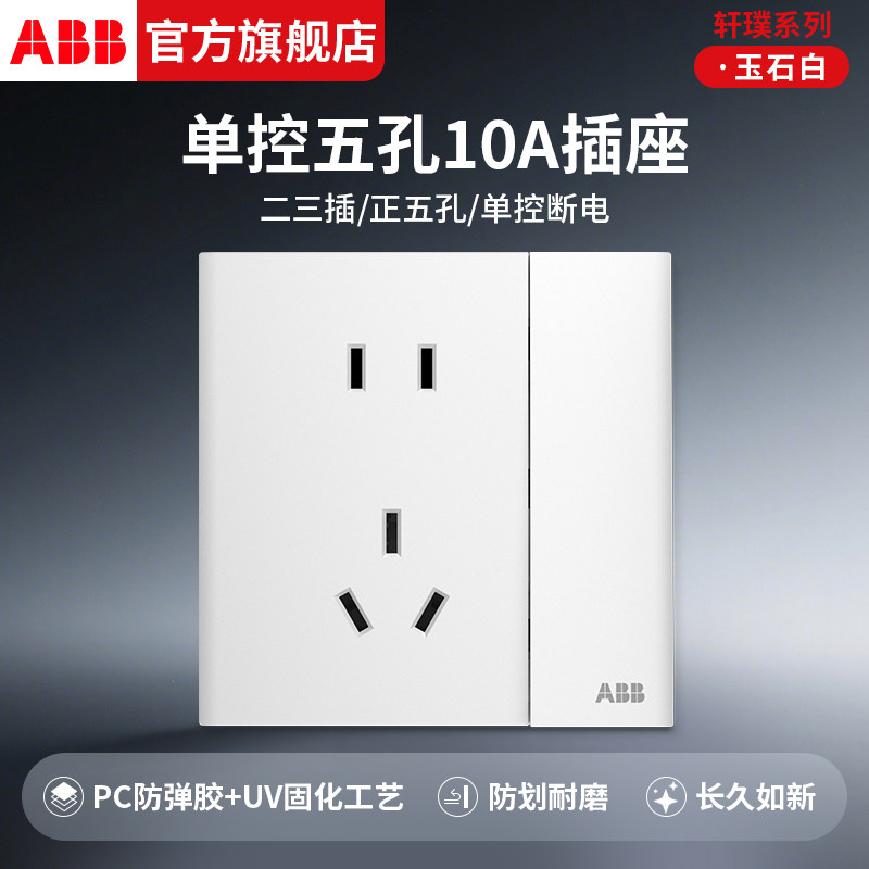 ABB单控五孔带开一键断电10A插座白色阻燃防触电墙壁电源插座厨房由