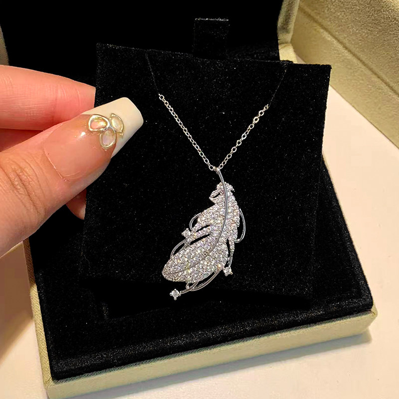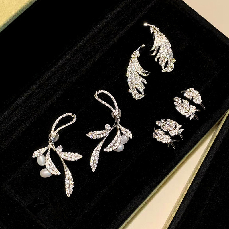 悬浮羽毛耳钉女纯银甜美小众独特树叶小卷毛珍珠耳环项链 李沁同款