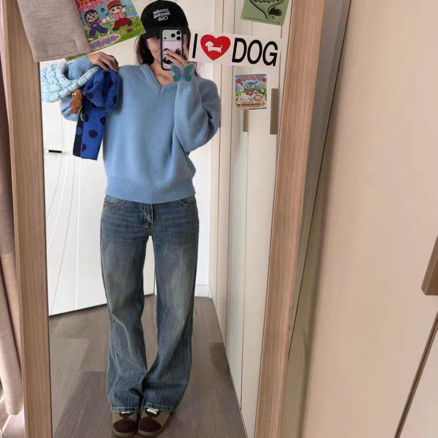 复古冰川蓝V领毛衣冬简约宽松休闲通勤针织上衣女 LINHOUSE林子家由
