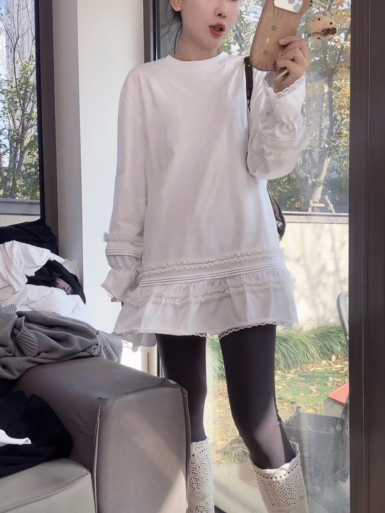 宽松百搭显瘦打底衫 潮 T恤女2026早春新款 加厚磨毛蕾丝拼接中长款