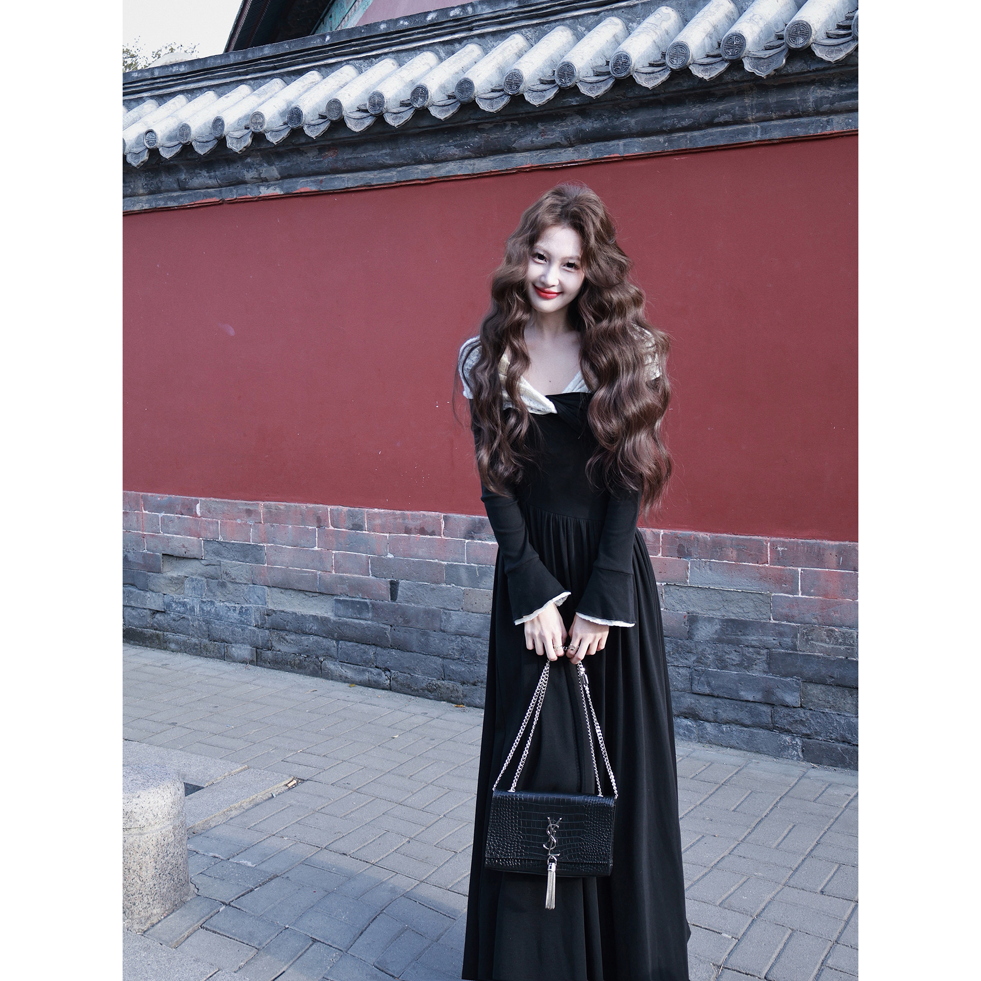 贵气时髦黑白拼色扭结喇叭袖 显瘦大裙摆连衣裙 黑天鹅 吃绿色菜由