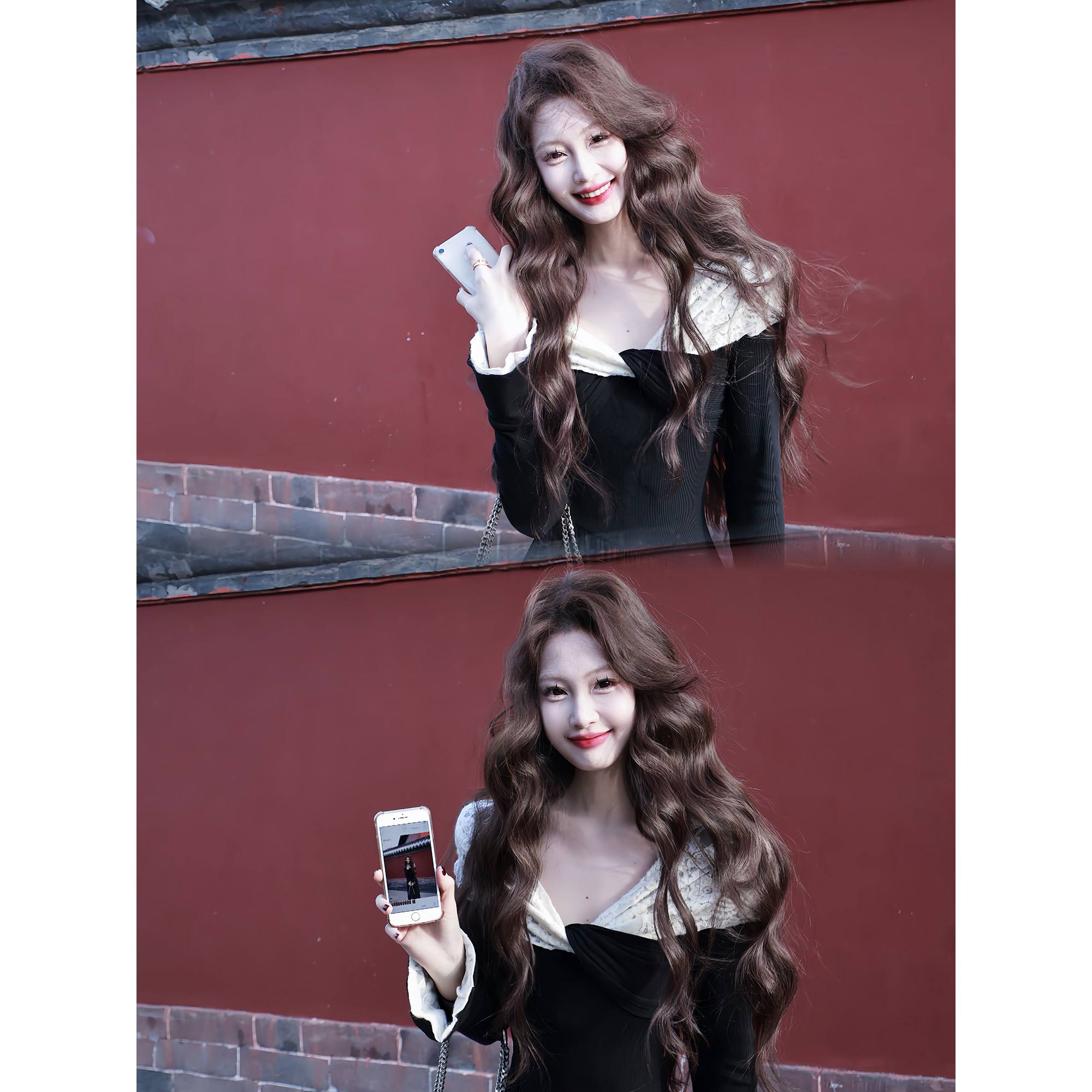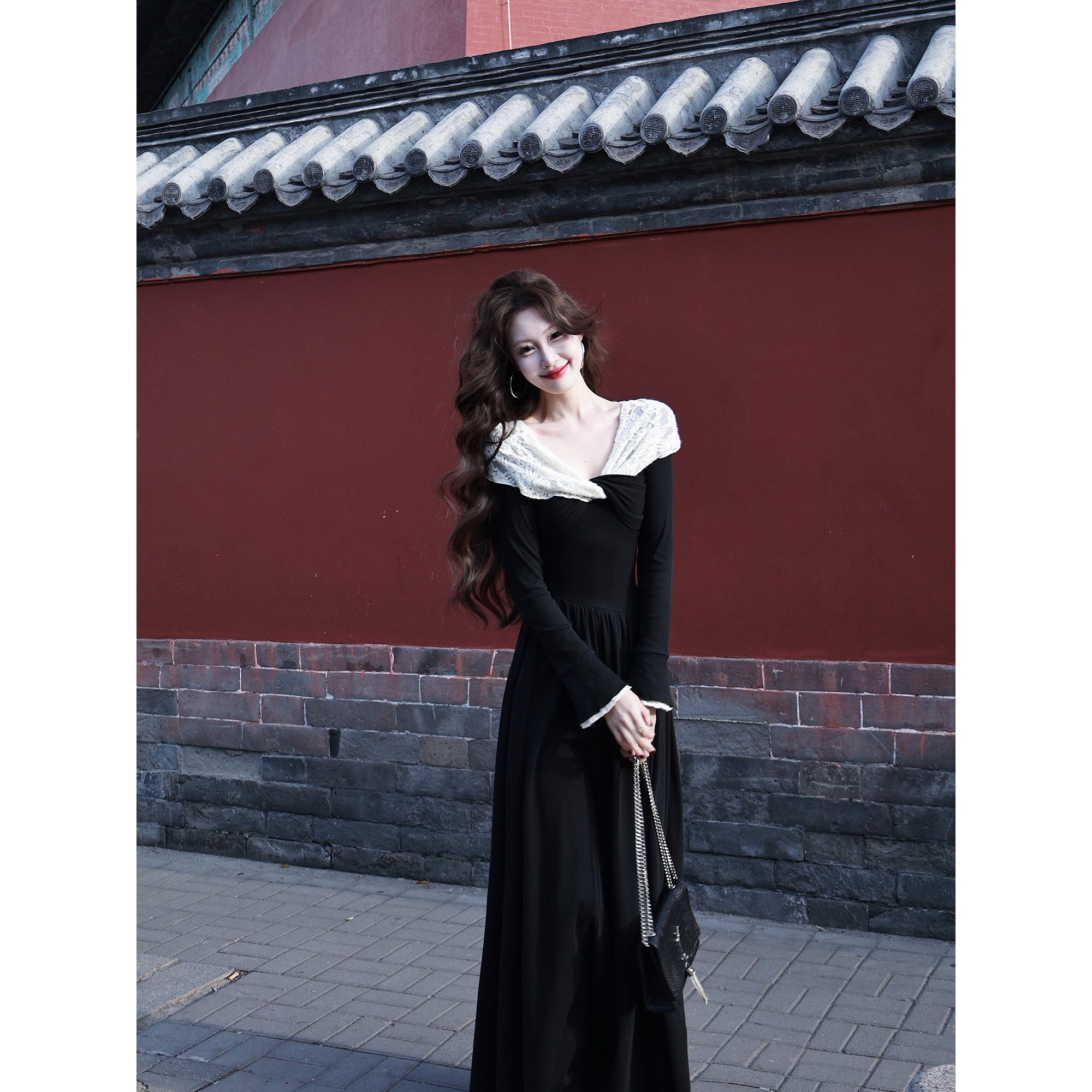 贵气时髦黑白拼色扭结喇叭袖 显瘦大裙摆连衣裙 黑天鹅 吃绿色菜