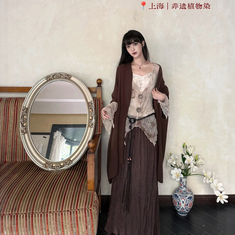 扎染蕾丝罩衫 联名款 「雨中生」植物染 新中式 腰带百褶半裙套装由