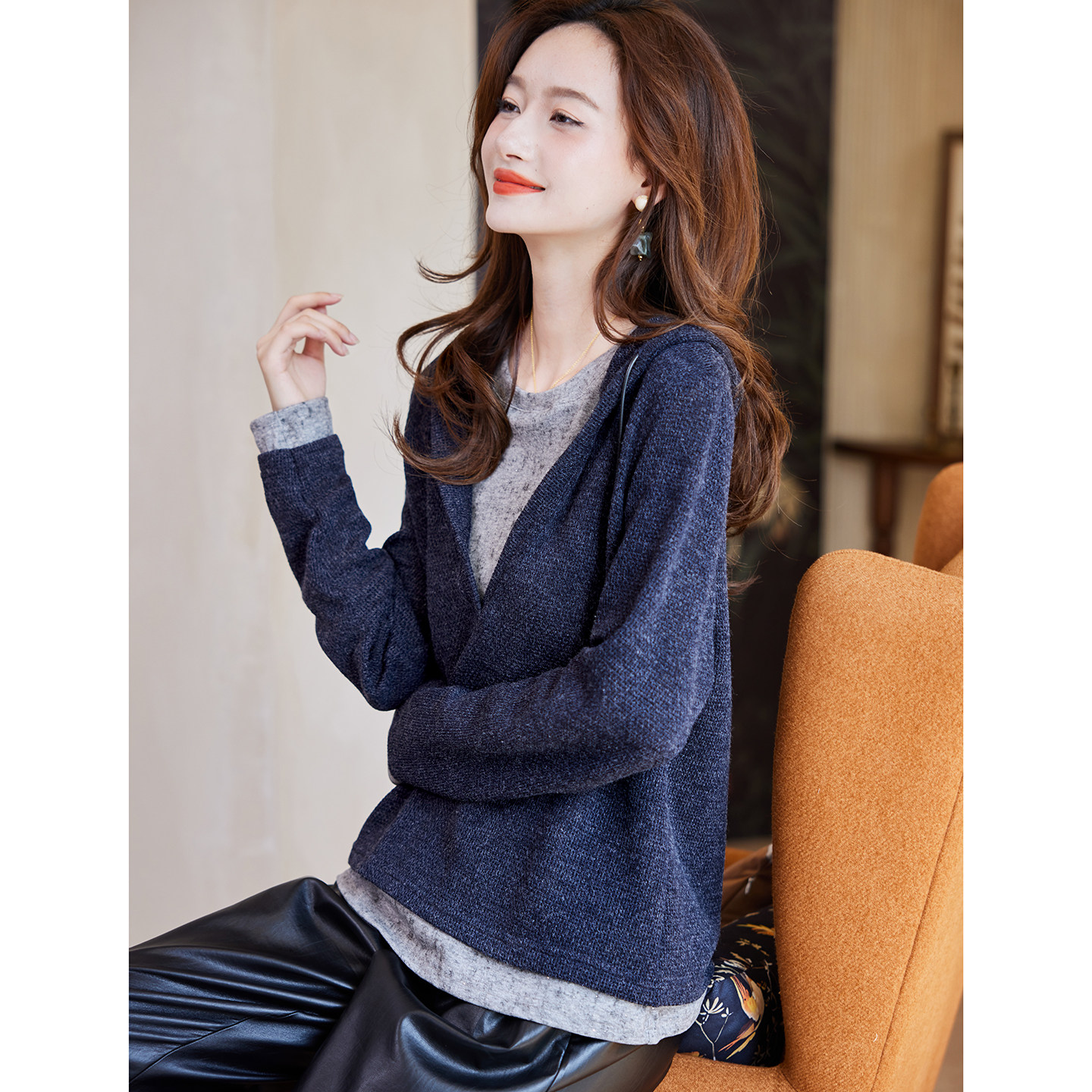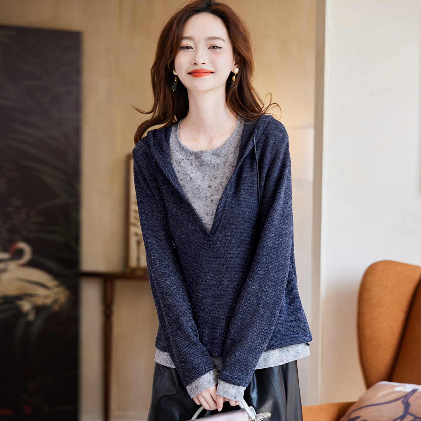 百搭休闲长袖 宝诗黎假两件亮片拼接针织衫 2026春季 简约时尚 女装由