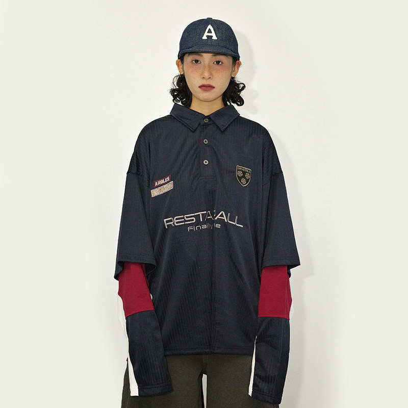 街头复古球服宽松bf风运动球衣假两件长袖 polo翻领T恤 美式 咕噜喔由