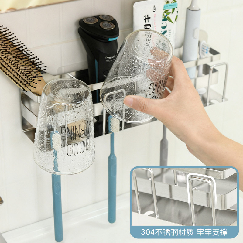 免打孔卫生间一家四口放牙杯挂架 304不锈钢牙刷牙膏置物架壁挂式由