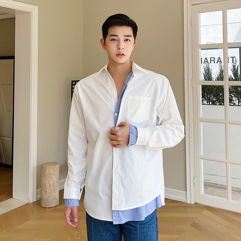 春夏个性 男长袖 白衬衫 韩版 假两件衬衫 条纹拼接设计感网红款 很仙由
