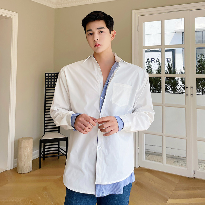 为您提供商品春夏个性 男长袖 白衬衫 韩版 假两件衬衫 条纹拼接设计感网红款 很仙的详细介绍,