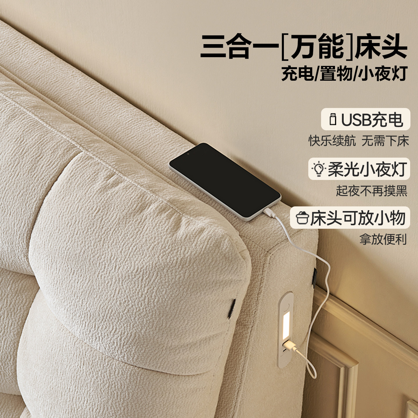 卡得利雪尼尔奶油风储物床现代简约齐边可拆洗超薄床头主卧布艺床