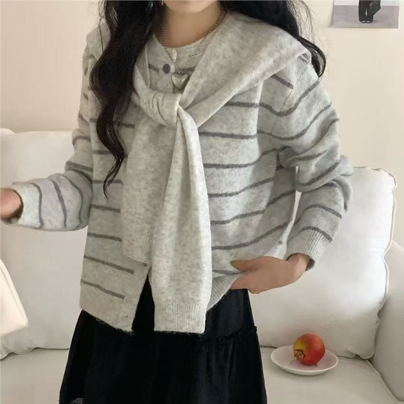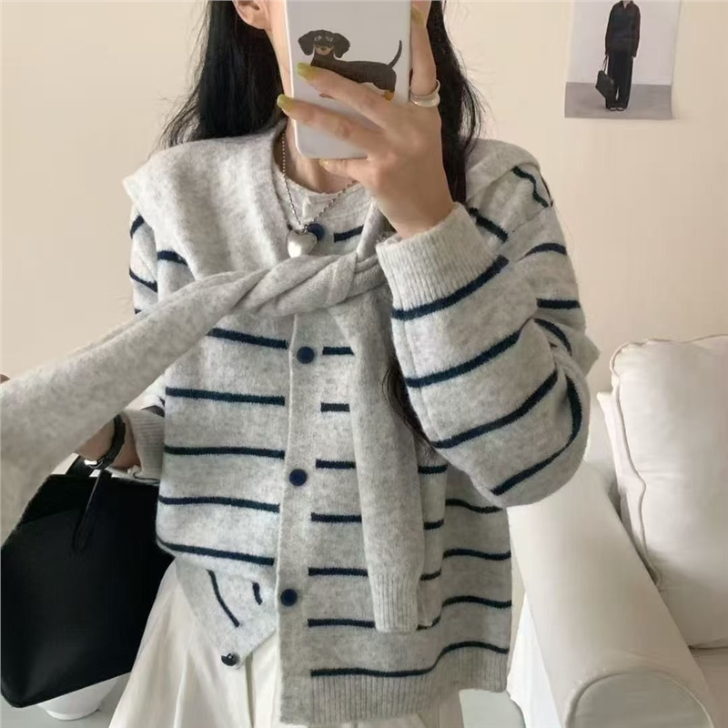撞色百搭2025新款 秋季 披肩针织上衣开衫 针织衫 带围巾 条纹毛衣长袖