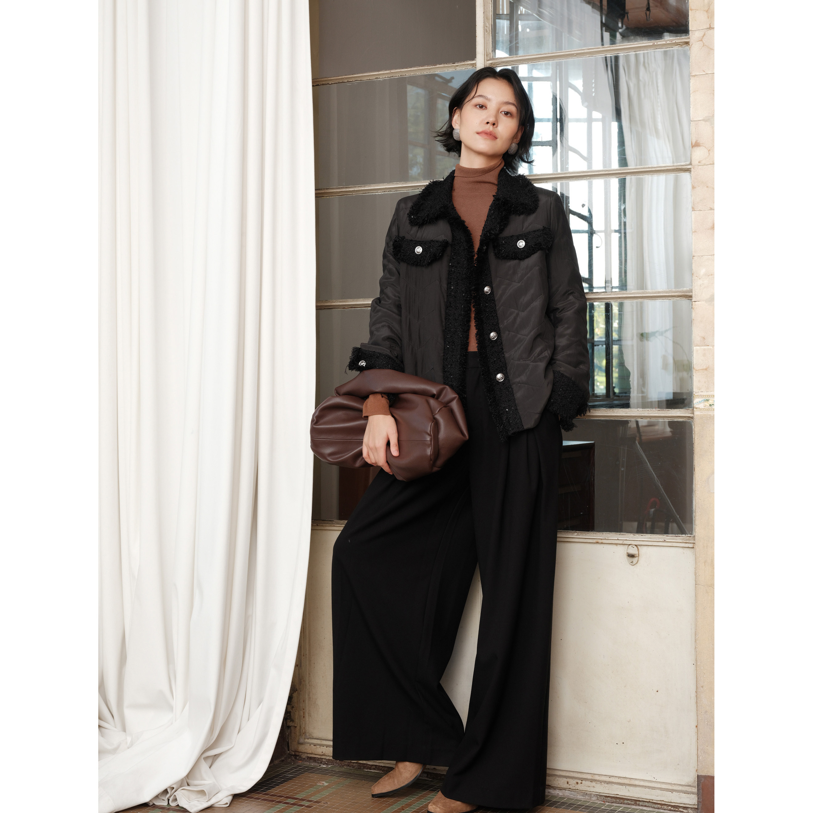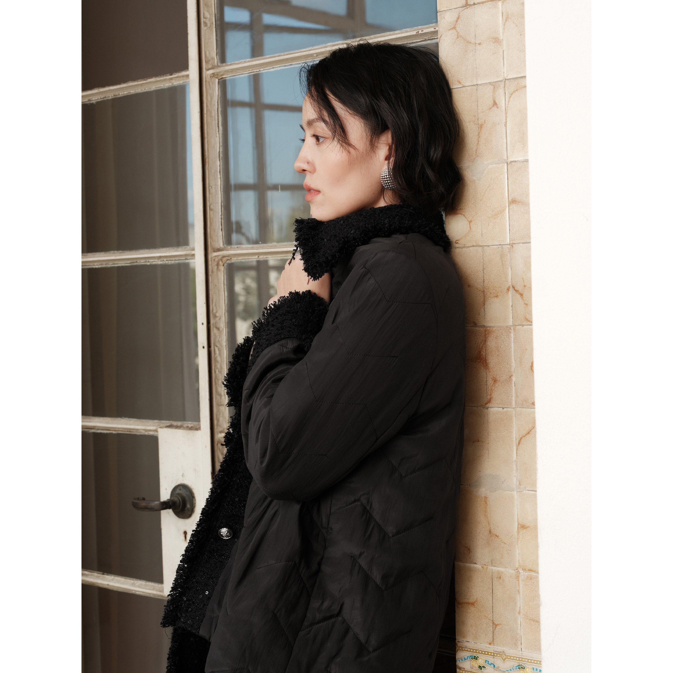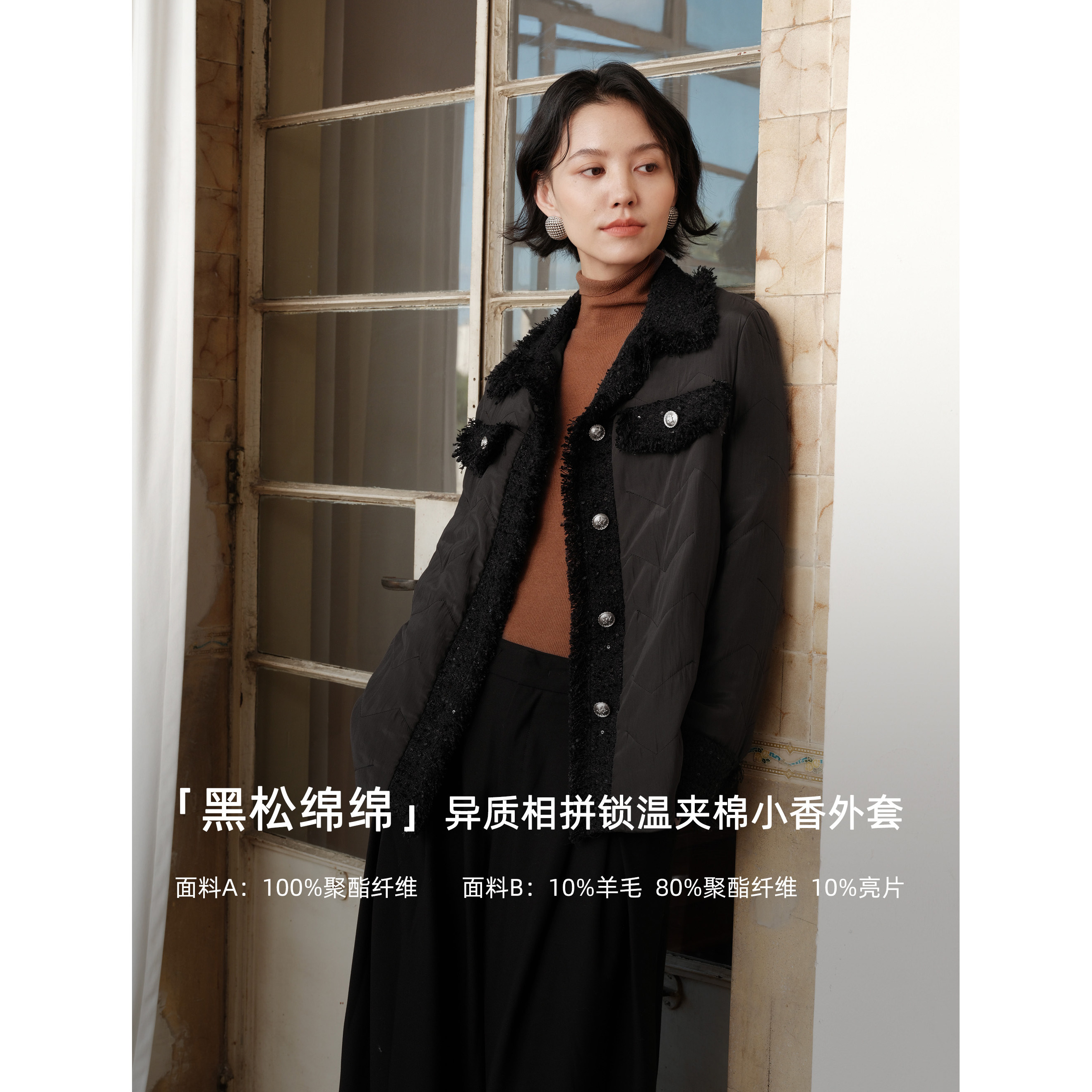 芝美日禾 锁温科技棉异质小香风拼接秋冬轻薄棉服外套 黑松绵绵