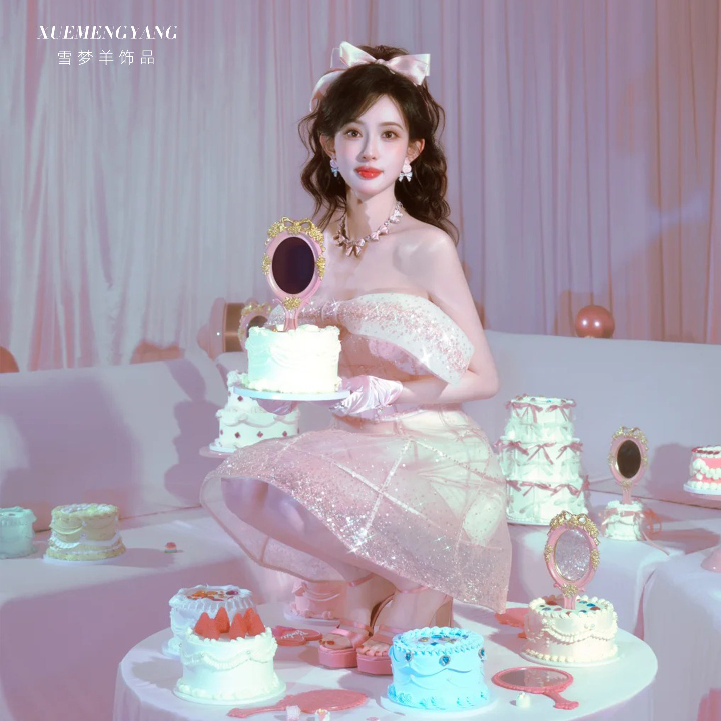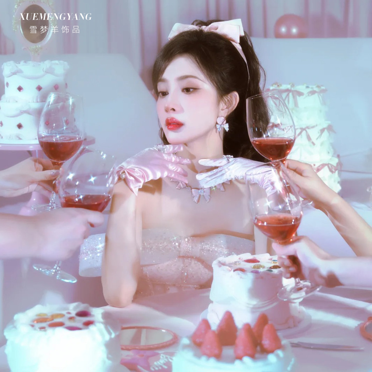 粉色短款 赫本风公主礼服缎面配饰女 手套婚纱新娘晨袍拍照道具法式由