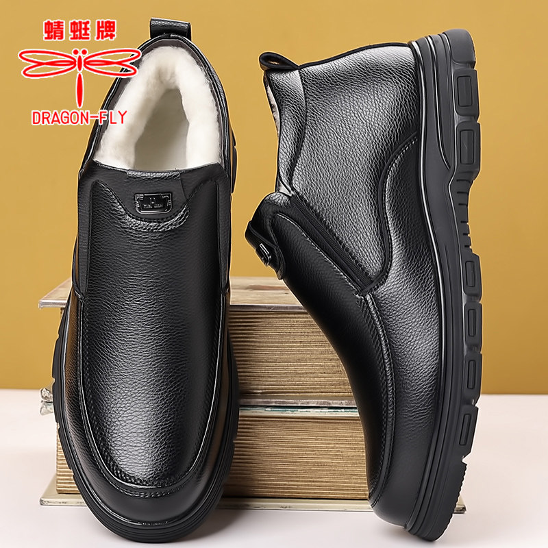 蜻蜓牌男鞋 真皮高帮棉鞋 男加绒加厚保暖羊毛中老年爸爸棉皮鞋 冬季