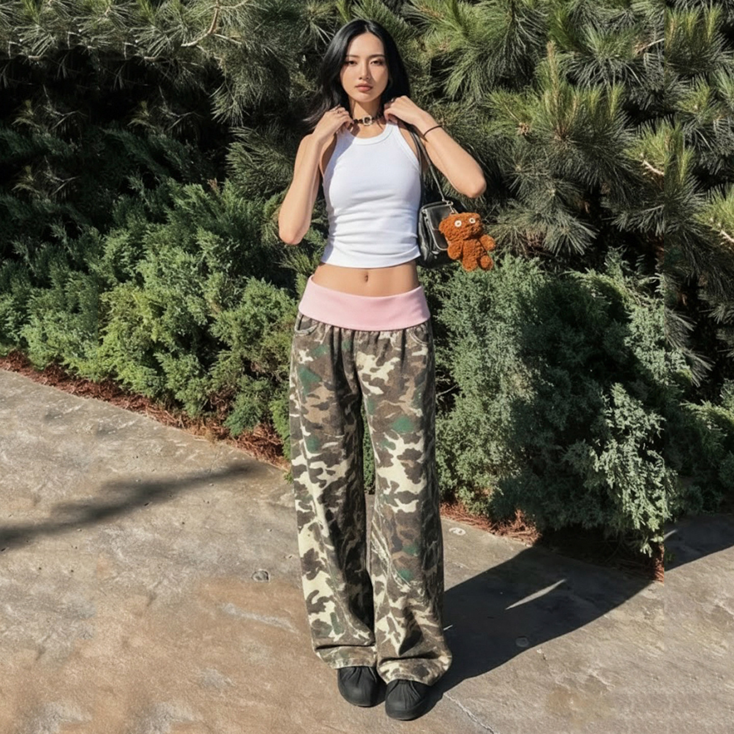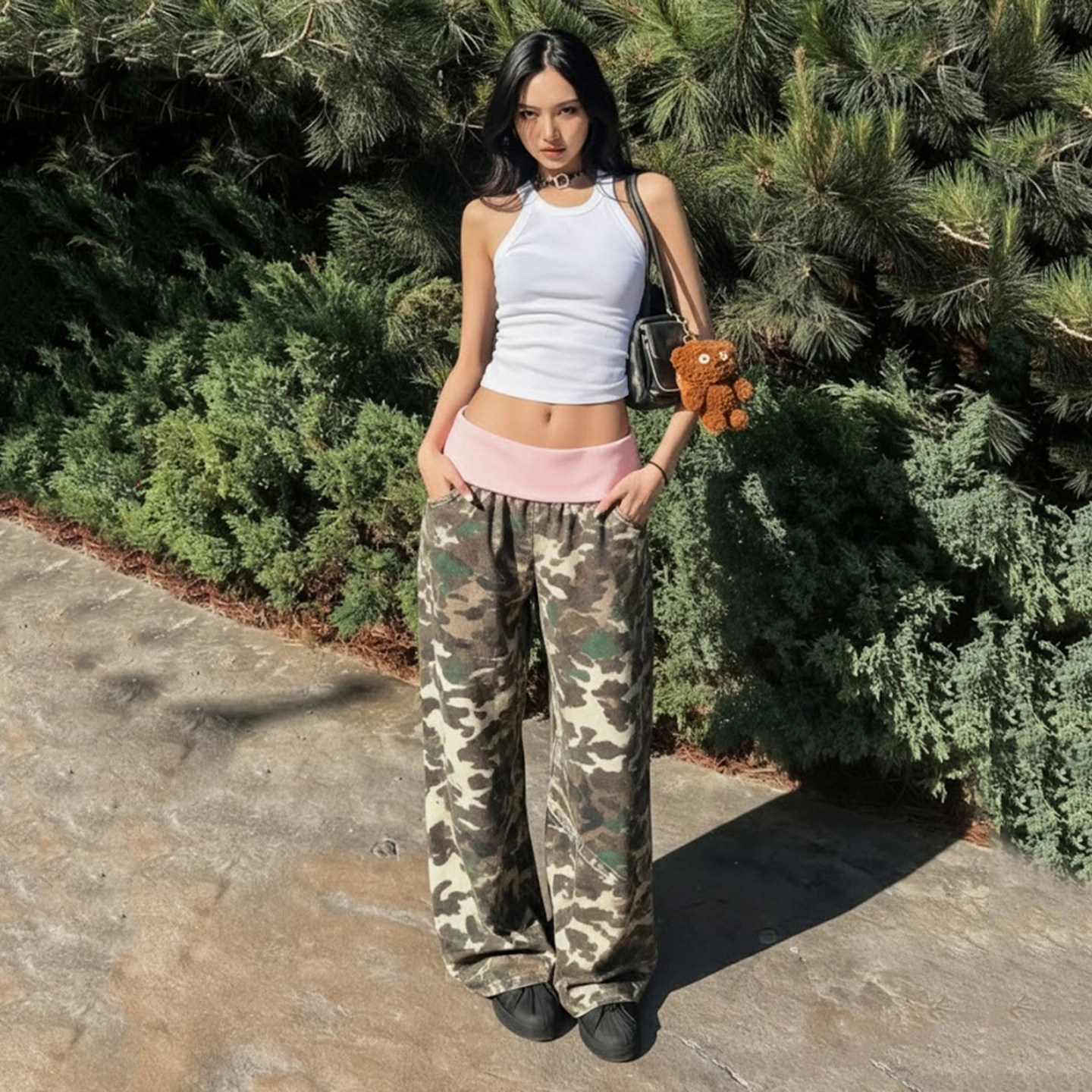 腰头拼接撞色迷彩低腰休闲裤 ROCKMORE 美式 复古 宽松显瘦阔腿裤由