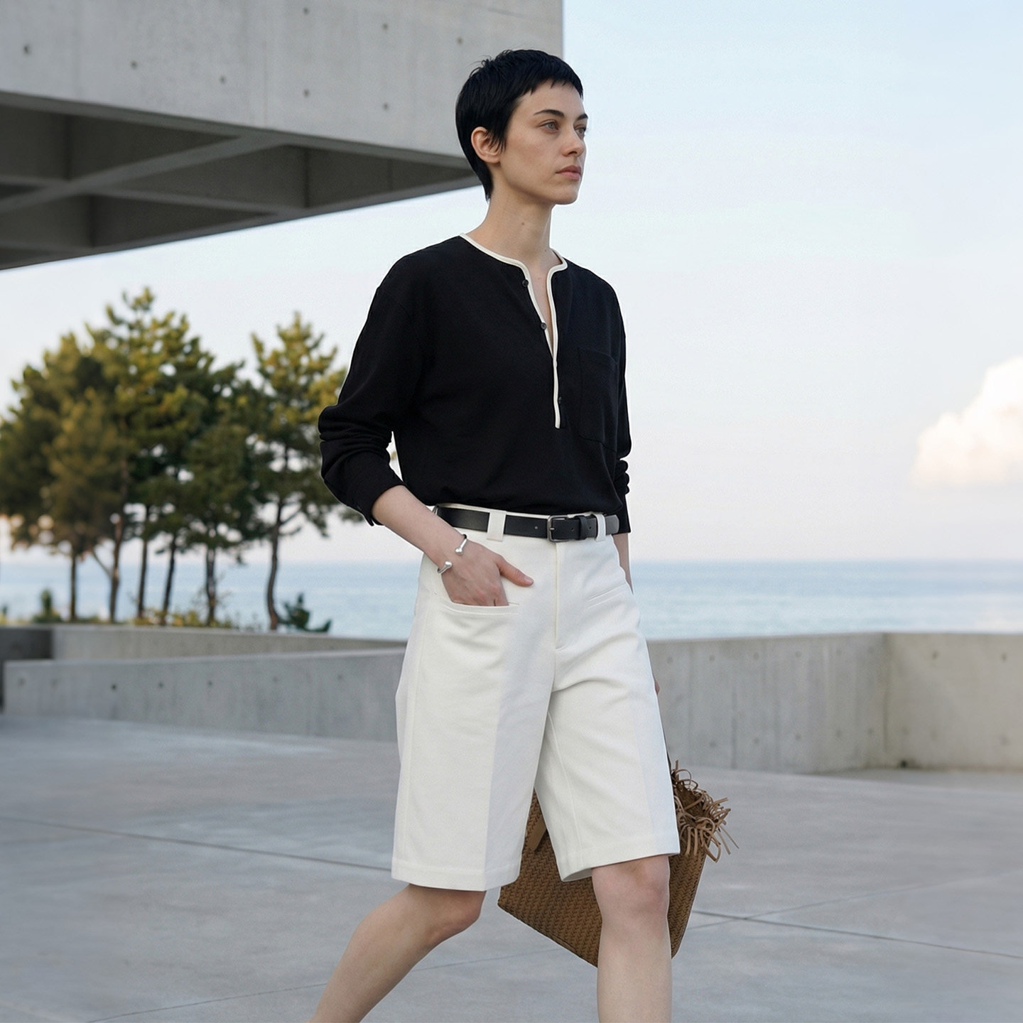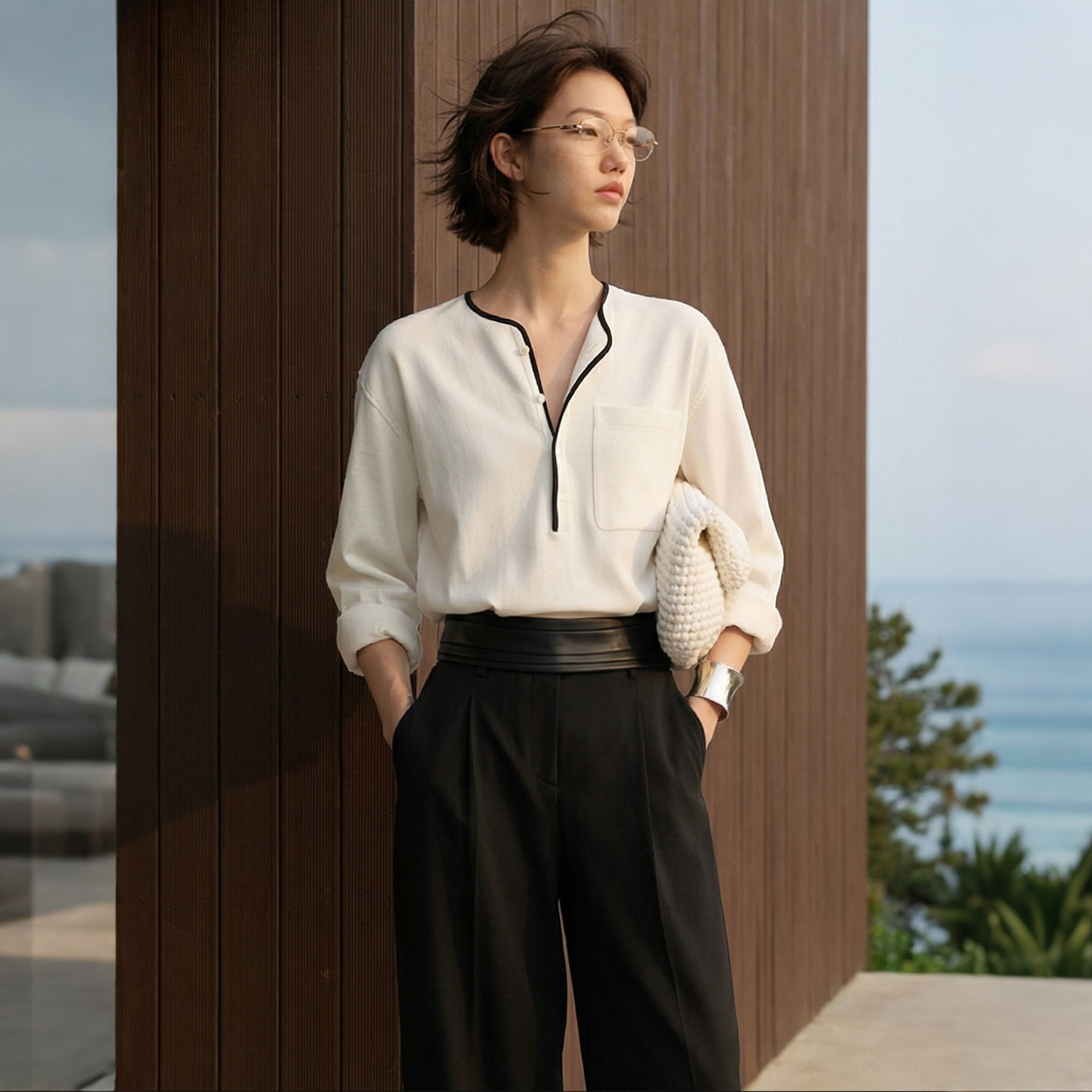 为您提供商品新款 撞色半开襟贴袋上衣通勤白T恤女 VALUE「墨镶笺」夏季 COMMON的详细介绍,