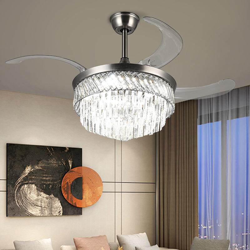 饰水晶吊扇灯外贸 客厅卧室隐形风扇灯铬色智能控制餐厅吊扇装由
